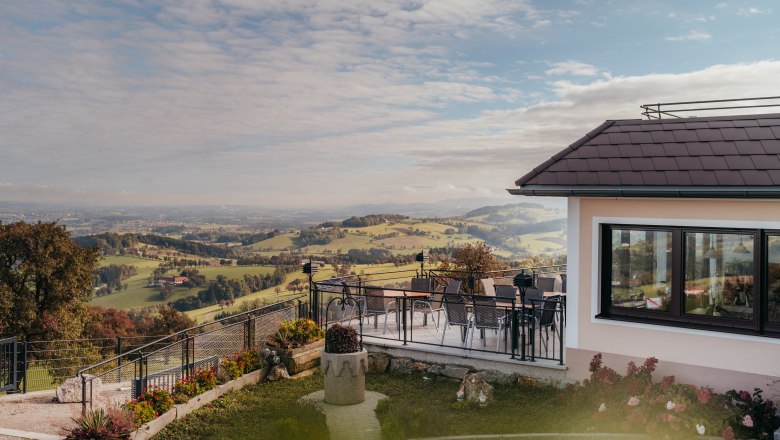 Gelegentlich bedarf es eines Perspektivenwechsels, um die eigene Lebensqualität zu steigern: Im Panoramagasthof Mitterböck bekommen Gäste im Wirtshausgarten einen grenzüberschreitenden Ausblick geboten – hier schmecken die Mostviertler Spezialitäten rund um Rinderbraten vom Mostviertler Rind besonders gut.
