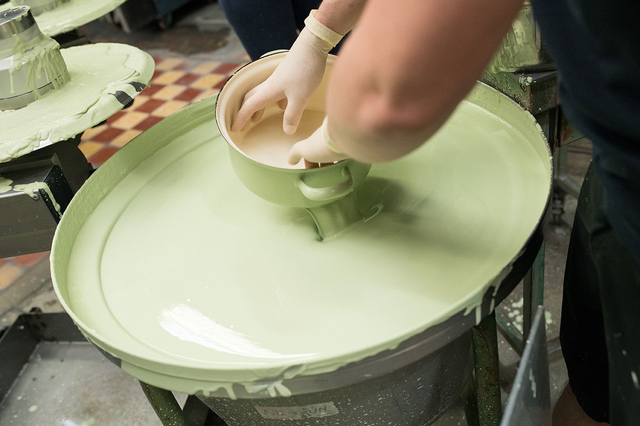 - Besuch des Emaillewerks: Sie sehen, wie der Emailleschlicker auf die Formen aufgetragen und bei 850°C im Brennofen aufgeschmolzen wird.