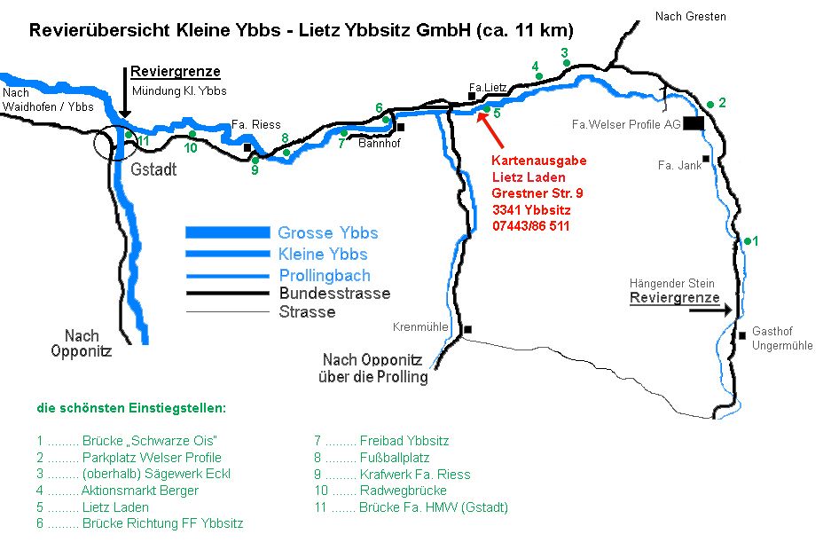 Das Fischereirevier heißt offiziell BI / 13 Ybbsitzbach (kleine Ybbs) und ist ca. 11 km lang. Es verläuft von der Mündung in die Ybbs flussaufwärts bis zum „Hängenden Stein“ (Grenztafel vorhanden). Es ist ein Salmonidenrevier mit schönen Riselstrecken aber auch einigen kurzen Stauräumen und Pools. Die kleine Ybbs fließt durch die Marktgemeinde Ybbsitz, die in etwa die Reviermitte markiert. Charakterlich entspricht die Kleine Ybbs einem kleinen Voralpenfluss, oberhalb von Ybbsitz hat sie mehr „Bachcharakter“.