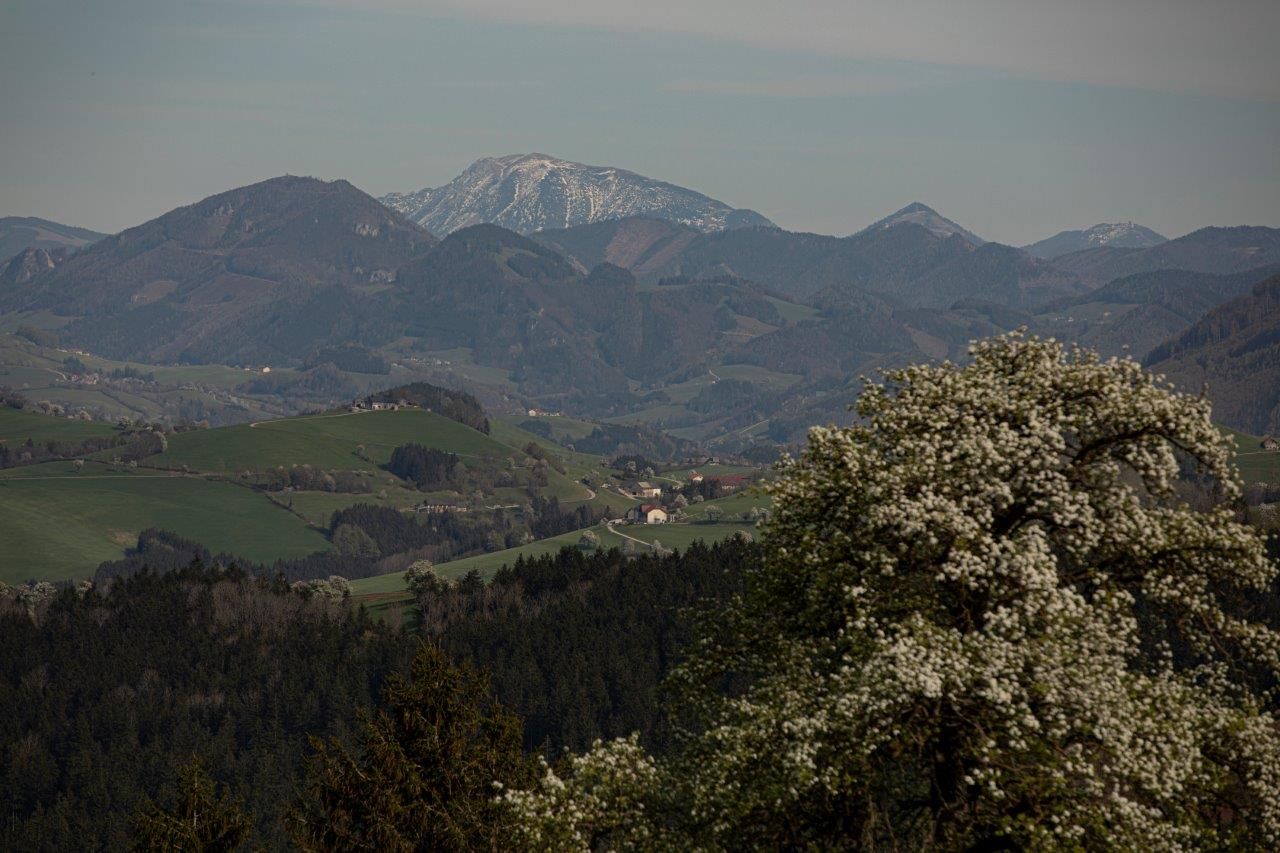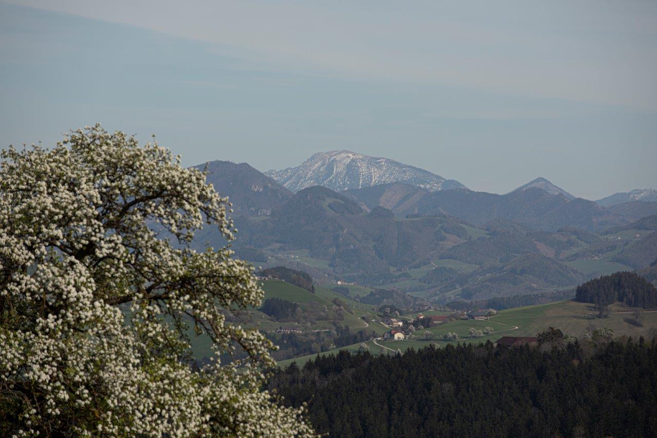 Der Blick, in Richtung Osten gerichtet, zeigt den Ötscher mit einem prächtigen Birnbaum davor.