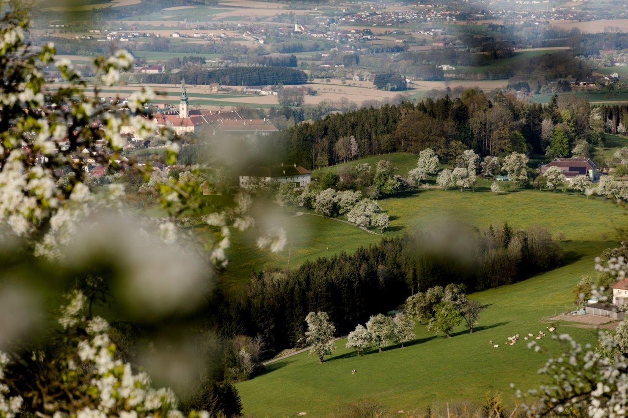 Zwischen den blühenden Birbäumen sieht man das Stift Seitenstetten.