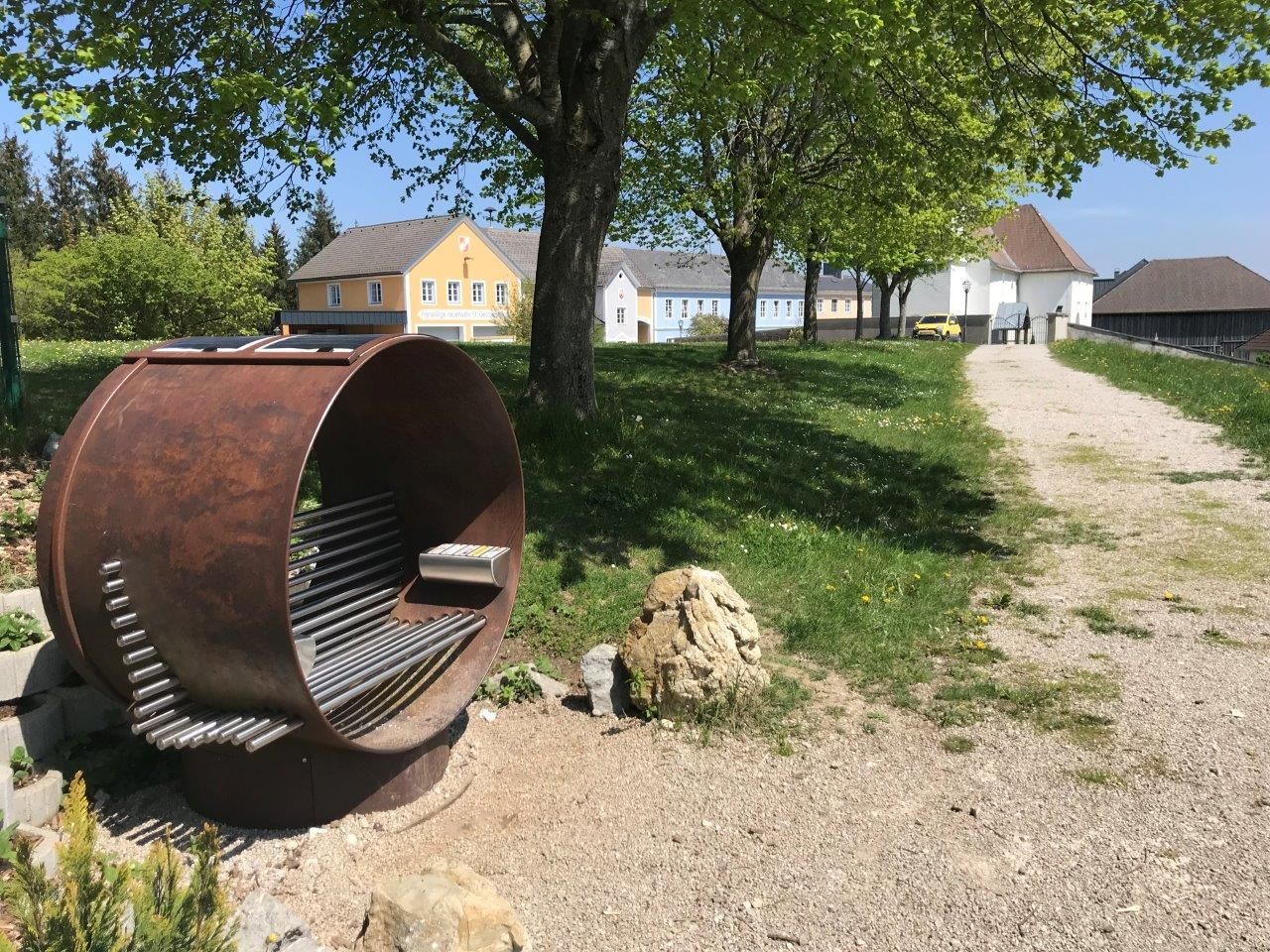 Der Hörsessel im Waidhofner Ortsteil St. Georgen in der Klaus ist eingebettet in das Ensemble rund um Kreuzkapelle und dem örtlichen Spielplatz. Durch den Blick nach Süden erhält man einen wunderbaren Blick in die Mostviertler Bergwelt.