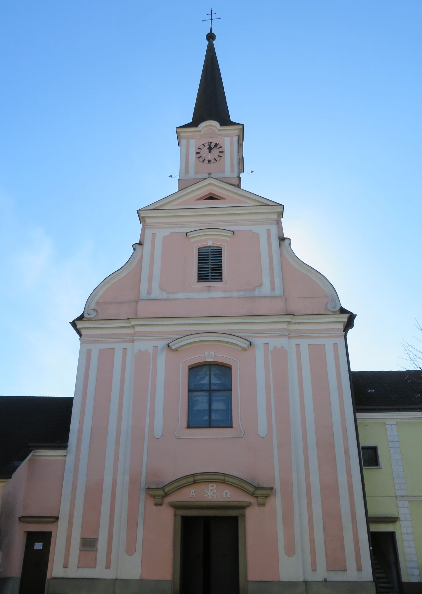 Das Kirchenschiff ist zweijochig, ihm schließt sich ein dreistufig erhöhter, annähernd quadratischer Chor mit runder Apsisnische an. An der Ostseite des Chores ist eine spätbaocke Sakristeitür. Darüber ein segmentbogenartiges vierflügeliges Oratoriumsfenster mit Oberlichte und ornamentalen Farbglasscheiben.