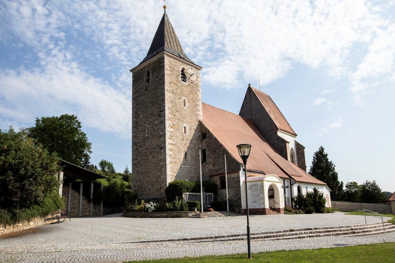 Das Langhaus, als ältester Teil der Pfarrkirche, dürfte um 1100 entstanden sein und gilt als ältester Kirchenbau des oberen Pielachtales. An der vorderen linken Kirchenwand ist ein Marmorgrabstein (aus ca. 1482), der schon sehr abgeschliffen ist. Dieser Grabstein ist kulturgeschichtlich für die Gemeinde sehr bedeutsam. Der rote Marmorstein zeigt auch das Wappen der Mainburger: einen Holzschlägel. Dieses Wappen ist auch heute noch im Gemeindewappen von Hofstetten-Grünau zu sehen.