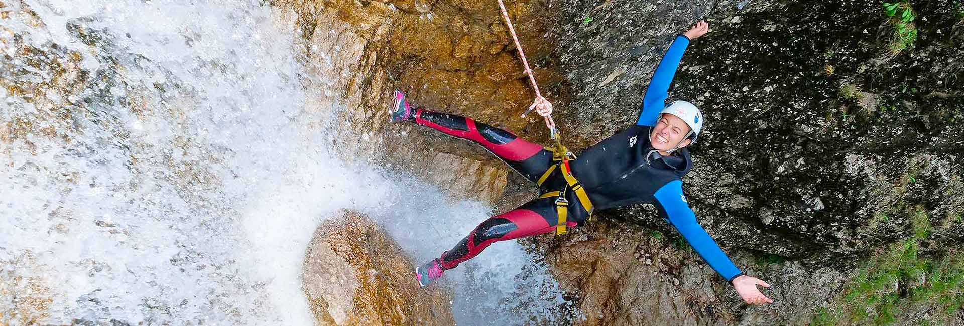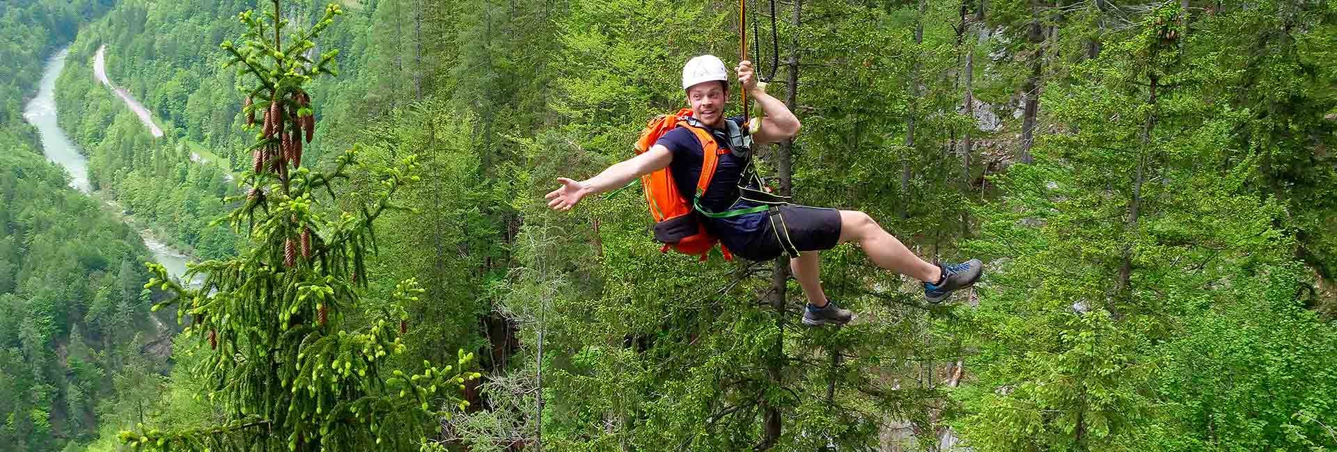 Beim Canyoning werden faszinierende Schluchten hautnah erlebt. Bei der abenteuerlichen Wanderung durch den Wildbach tauchen sie ein in eine außergewöhnliche Landschaft aus glitzernden Wasserfällen und glasklaren Naturpools. Ausgerüstet mit warmer Neoprenanzügen ist das für jeden der sich im weglosen Gelände bewegen und schwimmen kann ohne weiteres möglich. Der Guide sorgt für die Sicherheit und lässt die Teilnehmer mit dem Seil über spritzige Wasserfälle abwärts. Naturrutschen und Sprünge in Wasserpols sorgen für Abwechslung bei der Canyoningtour. Die Landschaft ist atemberaubend und nur beim Canyoning in dieser Form erlebbar.Hochseilgarten