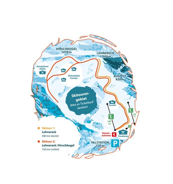 Im Skitourengebiet zeigt sich die Forsteralm von ihrer naturnahen Seite. Die Tour aufs Lehnereck gilt als Genussroute, während die Kombination mit dem Hirschkogel bereits rund 750 Höhenmeter umfasst – ideal für alle, die sich auspowern möchten.