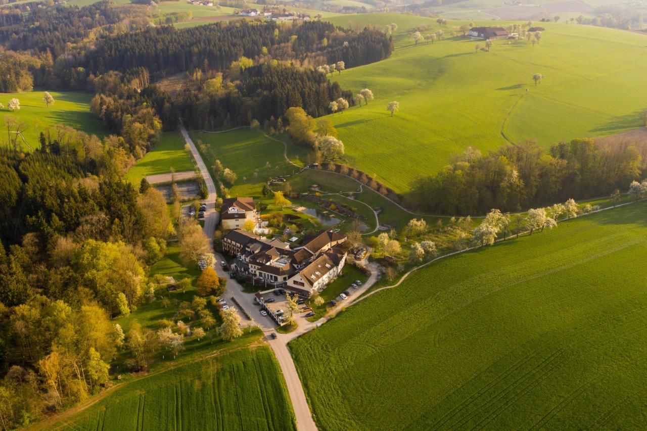 Luftaufnahme eines Resorts mit Garten und Teich in ländlicher Umgebung.