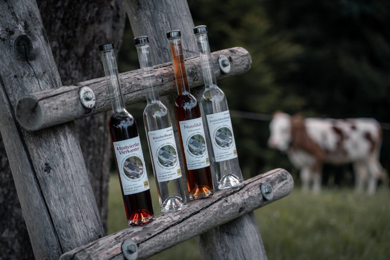 Kriecherl- und Zwetschkenschnaps, Obstler mit Himbeeren, Nusslikör, „Vierkanter“ – eine Spezialität aus Himbeersaft, Kirschrum, Rotwein und Obstler. Dörrzwetschken und Birnenkletzen. Bitte um telefonische Voranmeldung.