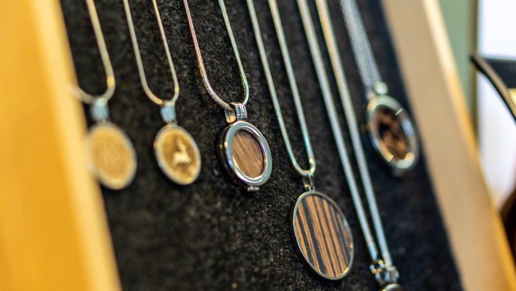 Elegante handgefertigte Schmuckstücke aus verschiedenen Holzarten runden das Portfolio von GH Desing ab.