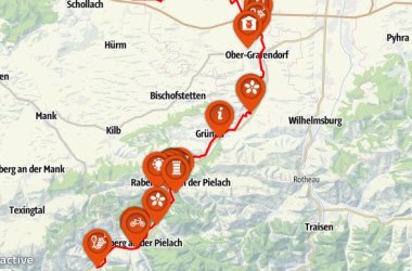 Leicht ansteigend geht es weiter nach Ober-Grafendorf und über Hofstetten-Grünau nach Rabenstein an der Pielach. Ab hier führt der Weg etwas bergauf nach Kirchberg an der Pielach und schließlich zum Endpunkt nach Dobersnigg in der Gemeinde Loich.