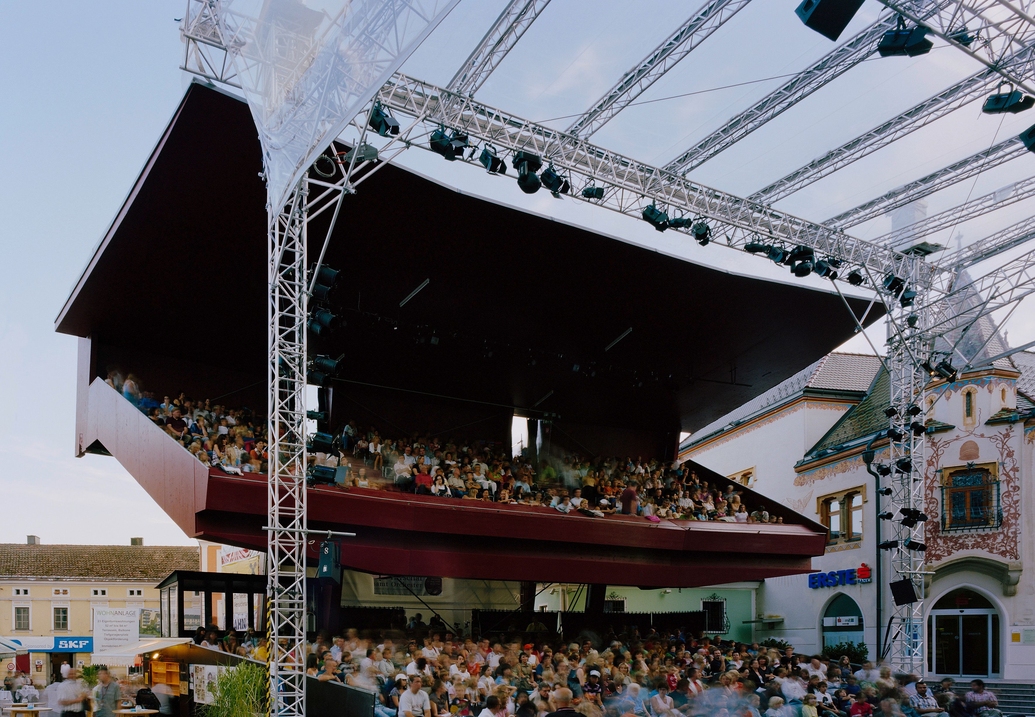 Die Tribüne des Theatersommers Haag ist ein besonderes Markenzeichen: Der zweigeschossige rote Holzbau wird jeden Sommer mitten im Stadtzentrum errichtet und ist schon für sich ein architektonisches Schauspiel. Die offene, großzügige Bauweise bietet beste Sichtverhältnisse und schafft ein ganz eigenes Festivalflair – urban, lebendig, einladend.