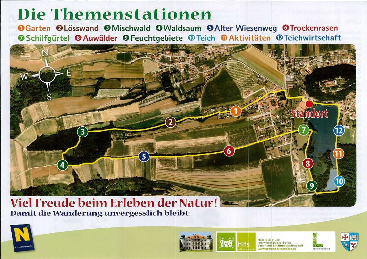 Die Start-Ziel Station des Rundwanderweges befindet sich nebem dem Parkplatz hinter dem Sitzenberger Feuerwehrhaus zwischen Tennisplatz unjd Schlossteich. Inklusive der Start-Ziel Station sind 13 Stationen am gesamten ca. drei Kilometetr langen Weg aufgestellt.