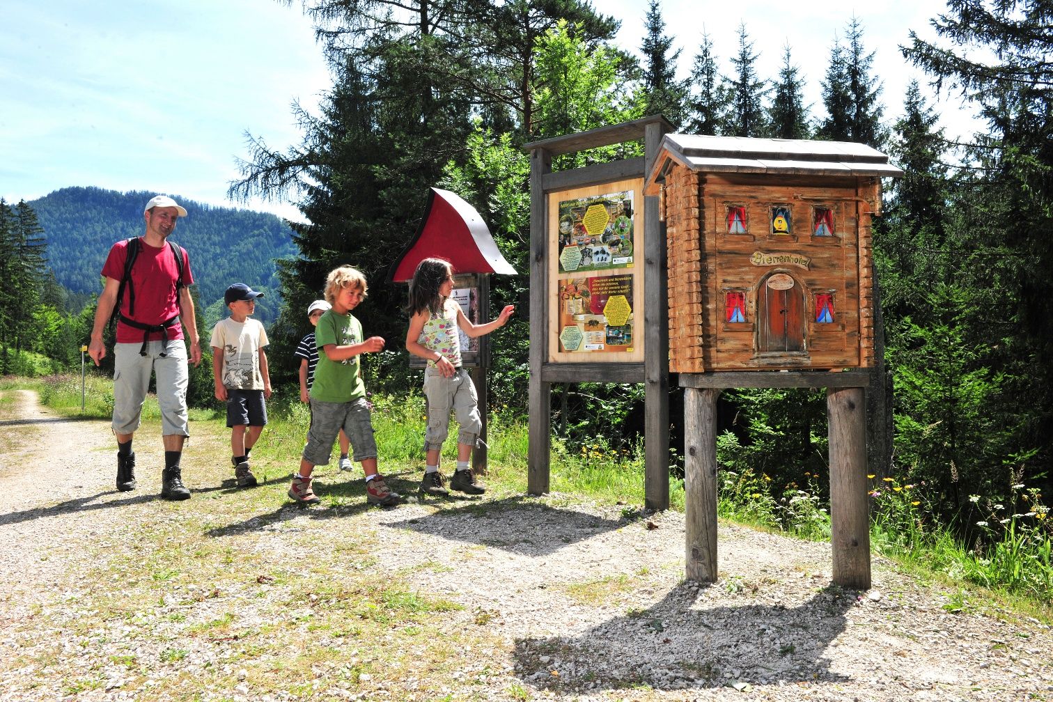 Ausgehend vom Parkplatz Kleinpromau auf der Landesstraße Richtung Lassing, vorbei an Zwergenhütte und Koboldkreuzung bis zur Schautafel "Moor" (links neben der Straße). Hier führt ein befestigter Weg bis zur Plattform im Moor, danach ein kurzer Anstieg durch den Wald bis zum Bienenhotel. Zurück geht es wieder vorbei an Koboldkreuzung und Zwergenhütte bis zum Ausgangspunkt.