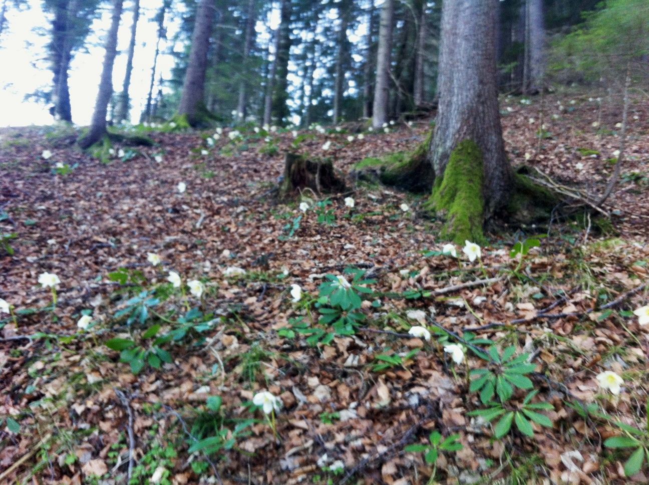 Das ist nicht nur in Winter ein wunderschönes Panaroma auf der Panorama-Loipen sondern auch im Frühjahr, Sommer und Herbst ein Wander-Highlight. Rechts gehen wir dem Weg entlang und biegen am Ende nach links in den Wald zum Übergang in das Rotenbachtal. Wir gehen ganz hinunter in das Rotenbachtal und folgen dann der Straße bis zum Gehöft Scheikl. Dort zweigen wir links ab auf die Scheiklhöhe. Im Frühling erwartet uns ein Schneerosenwald. Oben angekommen lädt uns eine kleine Sitzugruppe zum Rasten ein.