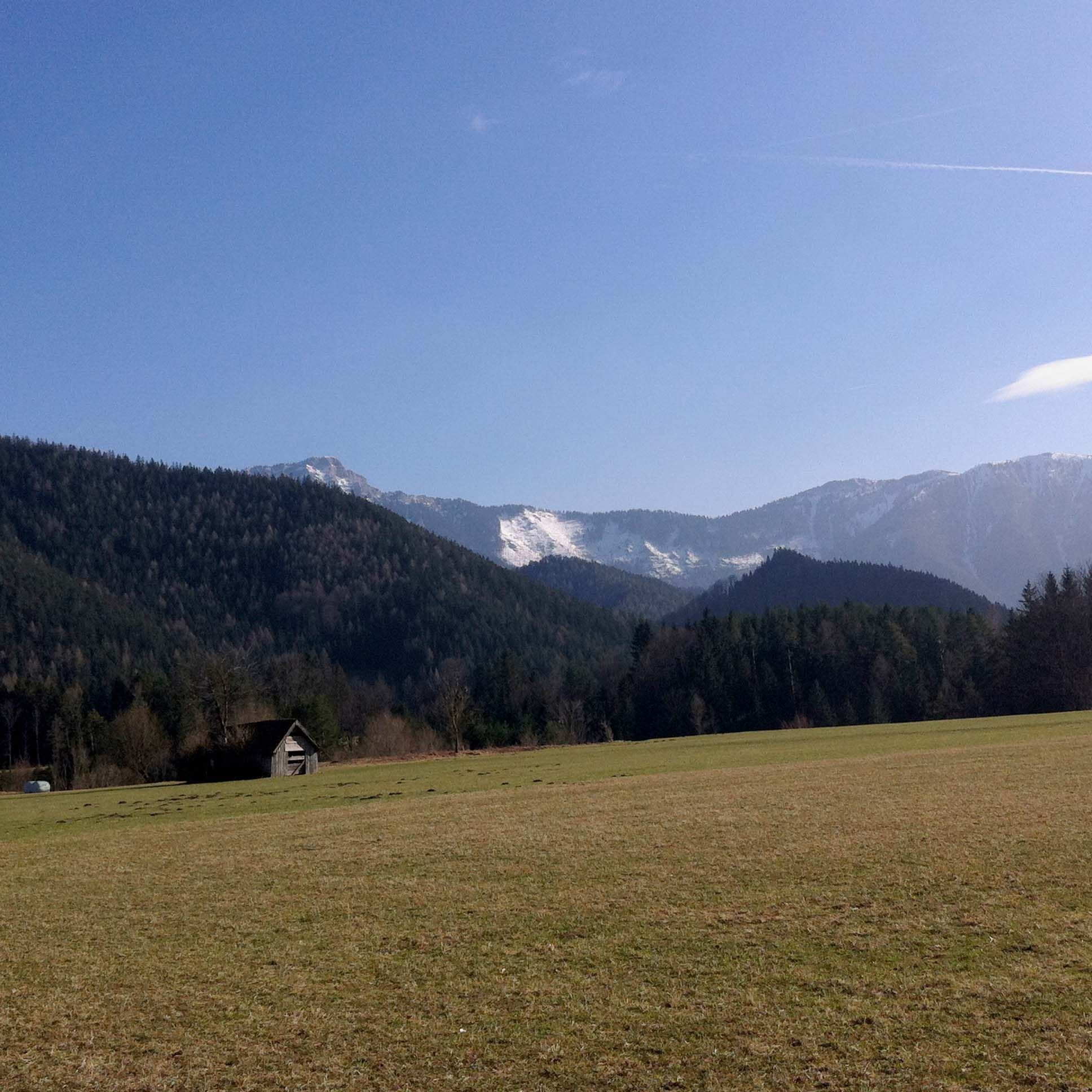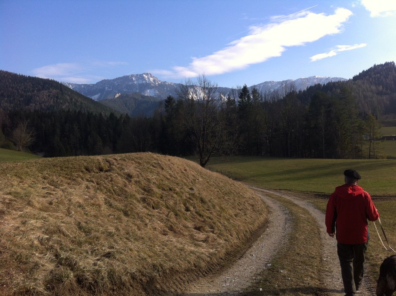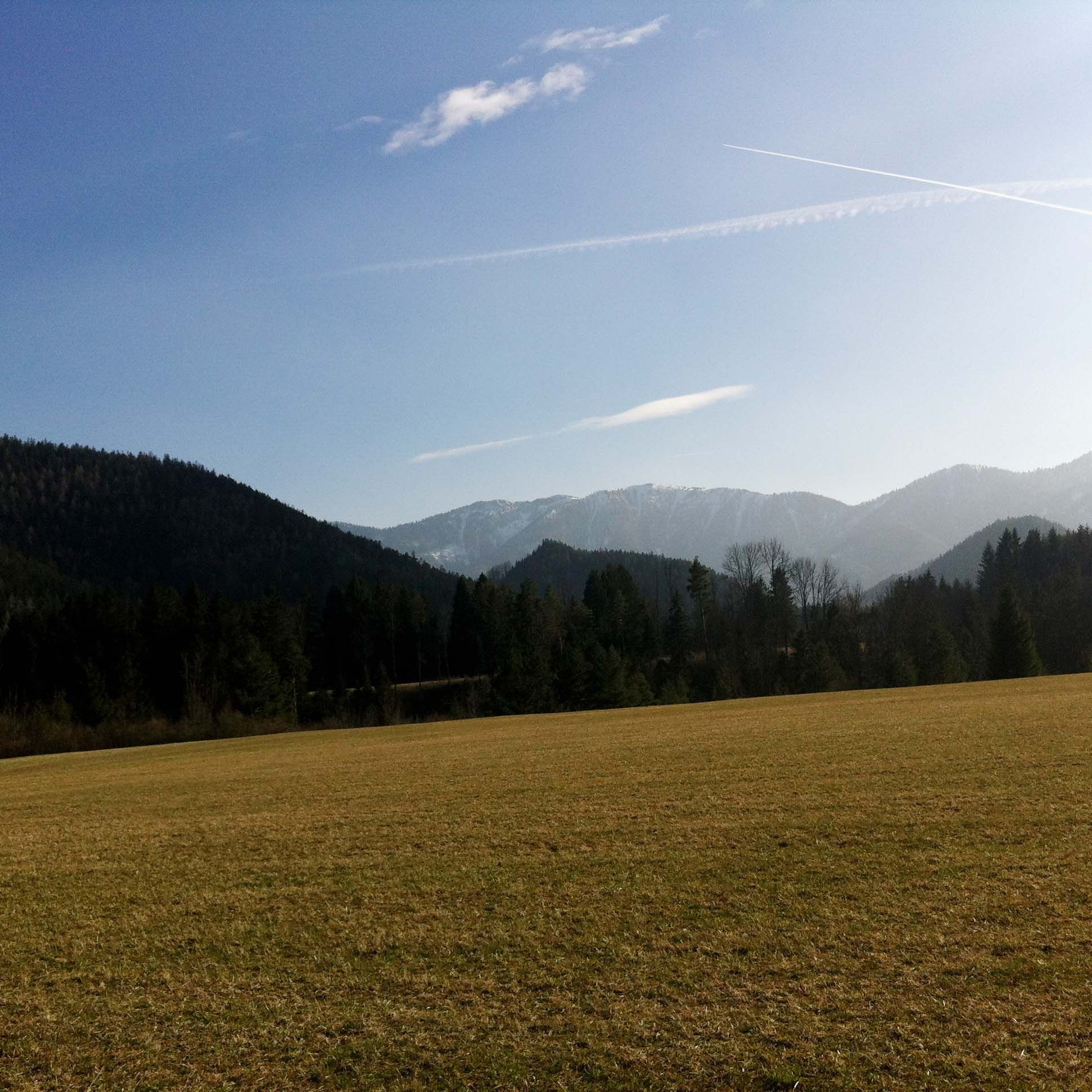 Der Scheiklhöhe-Rundweg beginnt mit den anderen Wegen 4,5 und 7 im Markt vor der Raiffeisenbank und geht dann der Unrechttraisen entlang neben dem Haus mit betreutem Wohnen weite. Danach zweigt der Weg ab zum Grillenbühel. Links daneben sehen wir ein sehr klares Wasserl und steigen dann stetig steil hinauf. Auf der rechten Seite schauen wir in die Unrechttraisen hinunter. Gleich haben wir es geschaftt und werden mit einem wunderschönen Ausblick auf den Goller belohnt. Etwas links daneben sehen wir dann auch die Hofalm und den Gippel. Ein kleines Stück weiter sehen wir noch weiter links auch den Schneeberg.