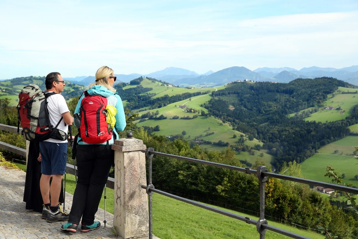 Von Aschbach-Markt aus, führt uns diese Etappe des Sonntagbergweges in südwestlicher Richtung an Schramelhof und Wipfelhof vorbei und wir erreichen nach nicht allzu langer Wanderung die kleine Gemeinde Krenstetten mit ihrer schönen, der Heiligen Maria gewidmeten Wallfahrtskirche. Hinter den Weilern Markstein und Bierbaumdorf überqueren wir die Url, wandern für einige Zeit an Bahngleisen entlang und erreichen nach kurzer Wanderung den sogenannten "Vierkanter Gottes", das Benediktinerstift Seitenstetten. Das inmitten der Mostviertler Hügellandschaft gelegene Kloster prägt schon seit Jahrhunderten Mensch, Kultur und Natur und beherbergt barocke Kunstschätze sowie einen besonders schönen historischen Stiftsgarten mit Themengärten und -wegen (z.B. die "Via Rosa"). Zwischen Stift und Stiftsgarten hindurch verlassen wir Seitenstetten auf einer schmalen, von Birken bestandenen Straße und biegen dann links in einen von Birnbäumen gesäumten Weg ein. Bei Hofing beginnt nun ein längerer Aufstieg auf den Blümelsberg (526m). Wir kommen an traditionellen Vierkanter-Höfen, Birnbäumen und einem Wildgehege vorbei und genießen einen wunderbaren Ausblick auf die umliegende Landschaft. Am Karl-Lammerhuber-Blick (großer Stein am Wegrand), genießen wir eine herrliche Aussicht auf Biberbach und die sanfte Hügellandschaft des Mostviertels, bevor wir den Abstieg antreten und in Richtung Rosenau weiterwandern. In Rosenau empfiehlt sich besonders der Besuch des Militärhistorischen Museums, bevor wir den anstrengenden Aufstieg zum Sonntagberg antreten. Oben aber werden wir müden Pilger durch den herrlichen Anblick der Wallfahrtsbasilika Sonntagberg für unsere Strapazen reichlich entlohnt und genießen erst einmal die herrlichen An- und Ausblicke.