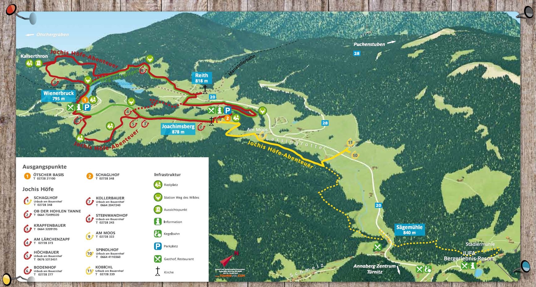 Mit Jochi geht es auf einer wunderschön und leicht zu wandernden Strecke zu elf Bauernhöfen der Gegend zwischen Wienerbruck und Annaberg. Hier gilt es Rätsel zu lösen. Und gleichzeitig können die Besucher mehr über Tiere und das Leben am Bauernhof erfahren. Was machen Haflinger, Kühe, Schweine und Hühner am Hof? Wie arbeiten Bauern traditionell am Feld und im Wald?