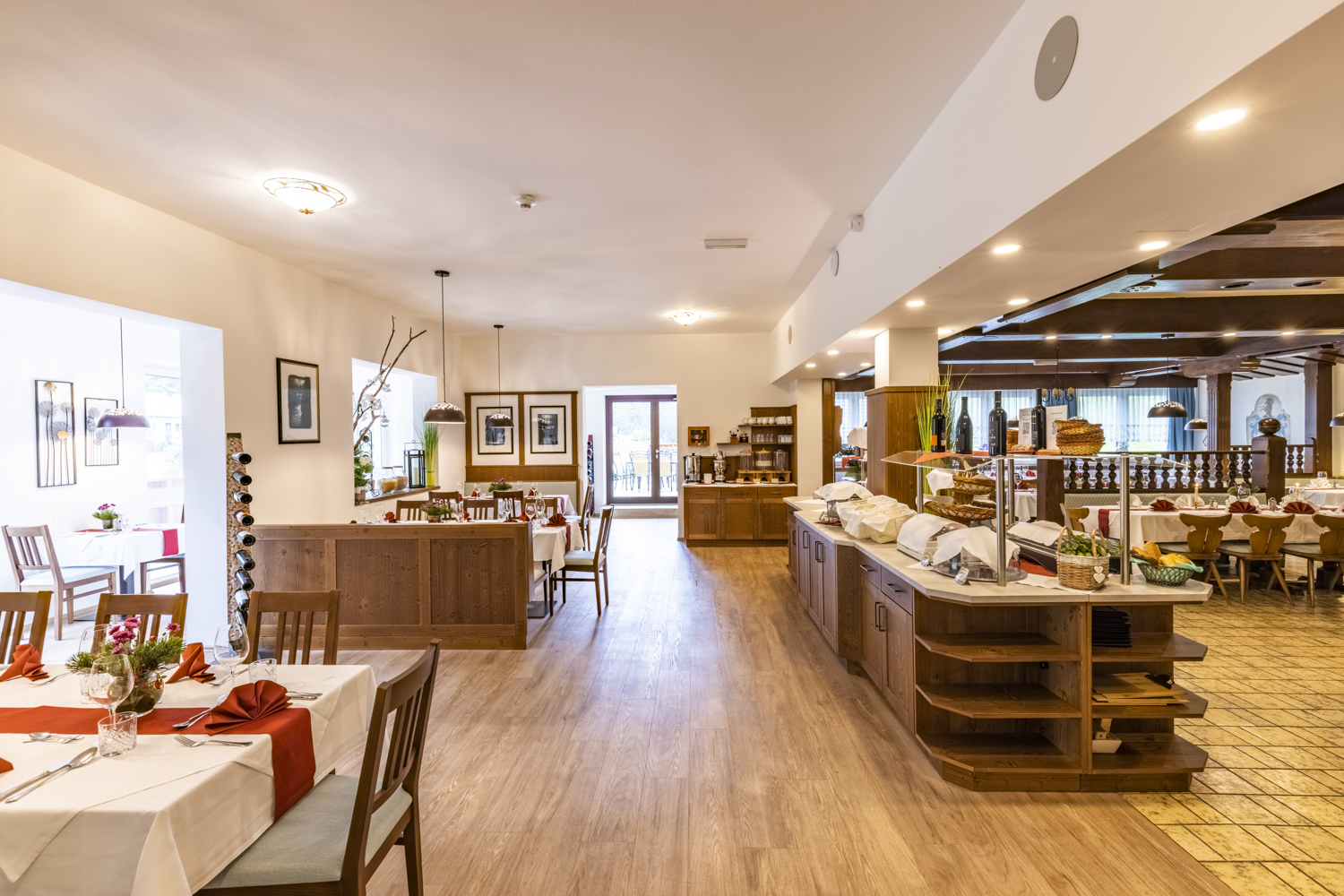 Kulinarisch verwöhnt das hoteleigene Restaurant mit regionalen Spezialitäten – auch auf der Panoramaterrasse mit Blick in die Berge.