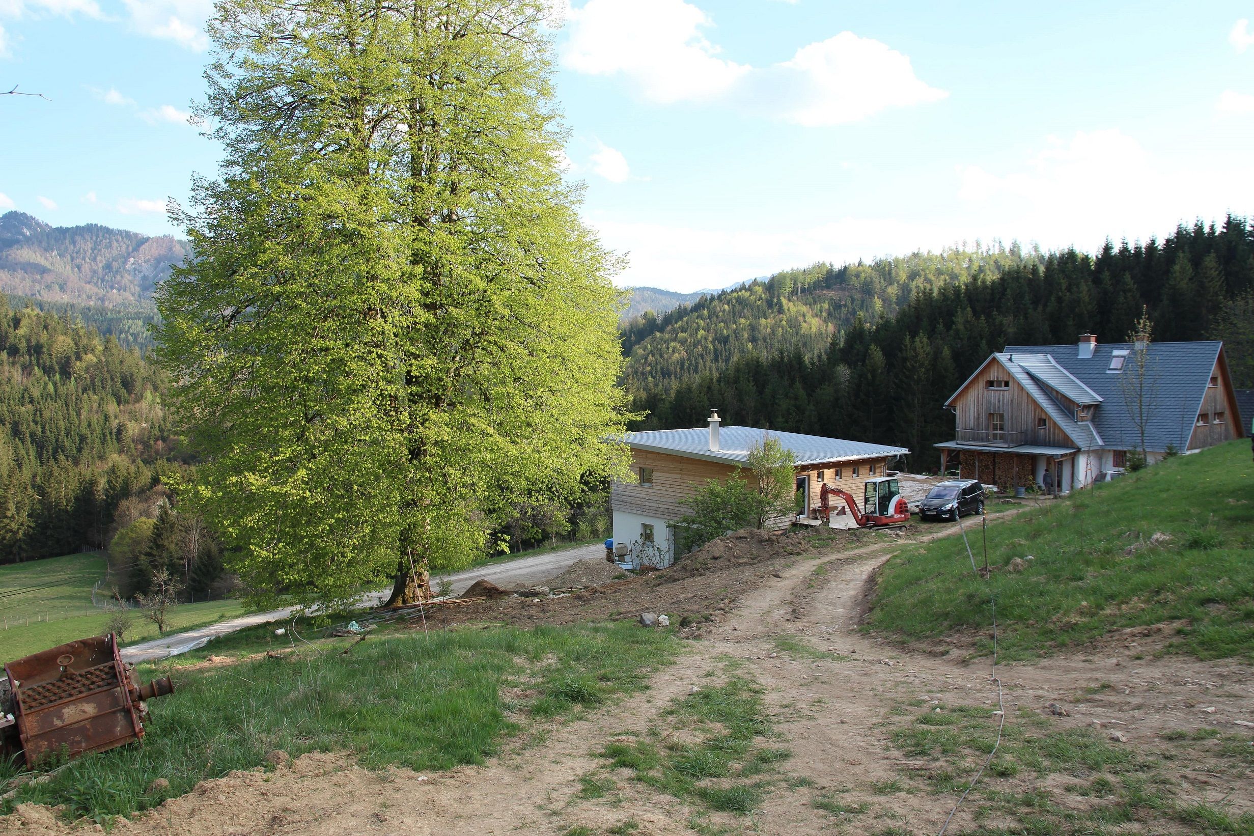 Das Appartement ist das obere Stockwerk in einem neu gebauten Gebäude auf dem Bauernhof. Rund um das Appartement gibt es Terassen mit Gemüsegärten, einen Hühnerstall, in sicherer Entfernung ein paar Bienenstöcke und auch ein Gehege mit Rehen und Hirschen. Ein paar Minuten bergab fließt ein Bach, da gibt es einen Fischteich und unter einem Wasserfall eine Badestelle.