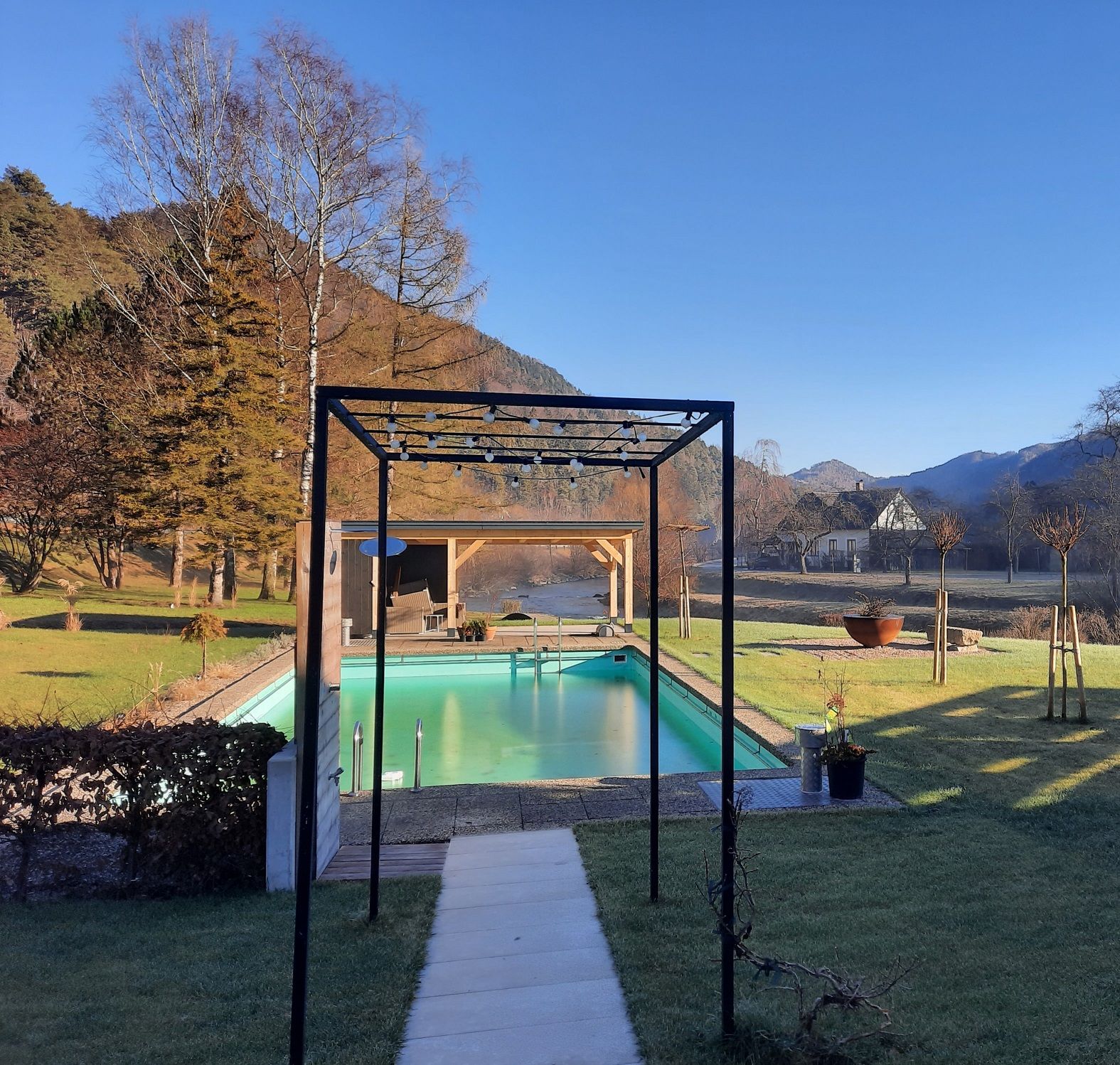 Der großzügige Garten mit Außenpool und direktem Zugang zur Erlauf lädt nach einem erlebnisreichen Tag zum Entspannen ein.