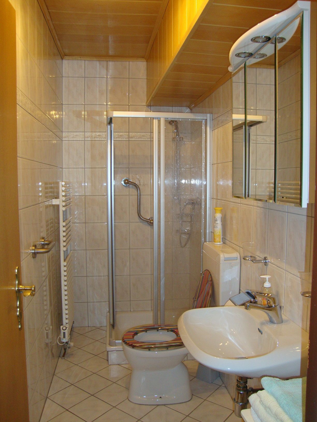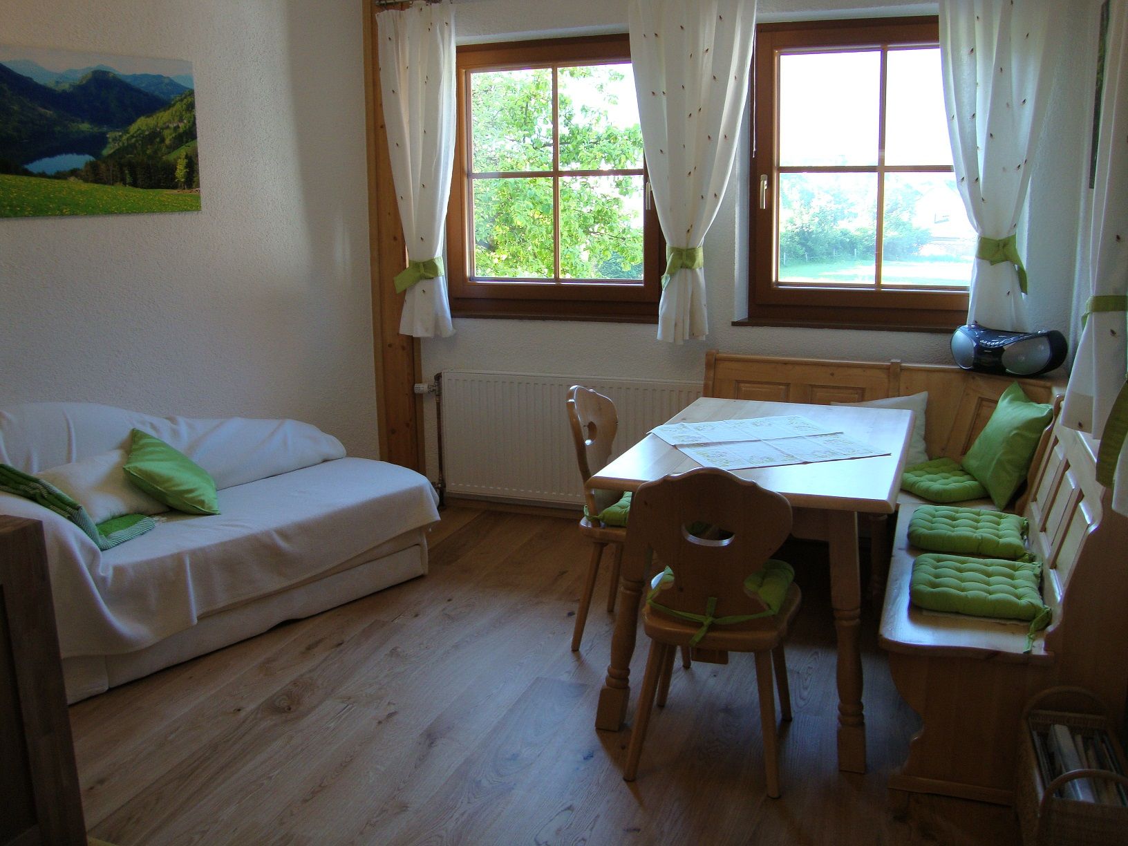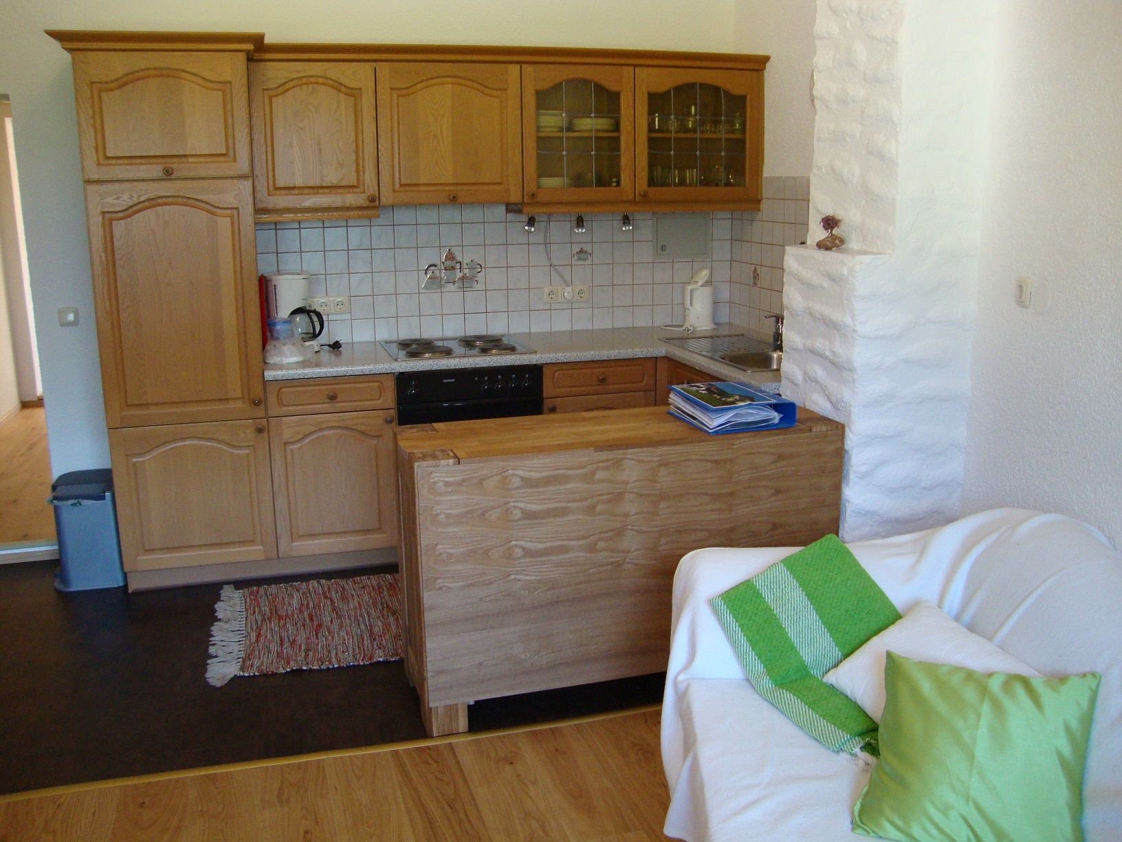 Unsere Ferienwohnung ist ca. 70m² groß und bietet ein großzügiges Schlafzimmer, ein Wohn/Schlafzimmer, eine geräumige Wohnküche mit Sitzgruppe und ein Bad mit Dusche/WC.