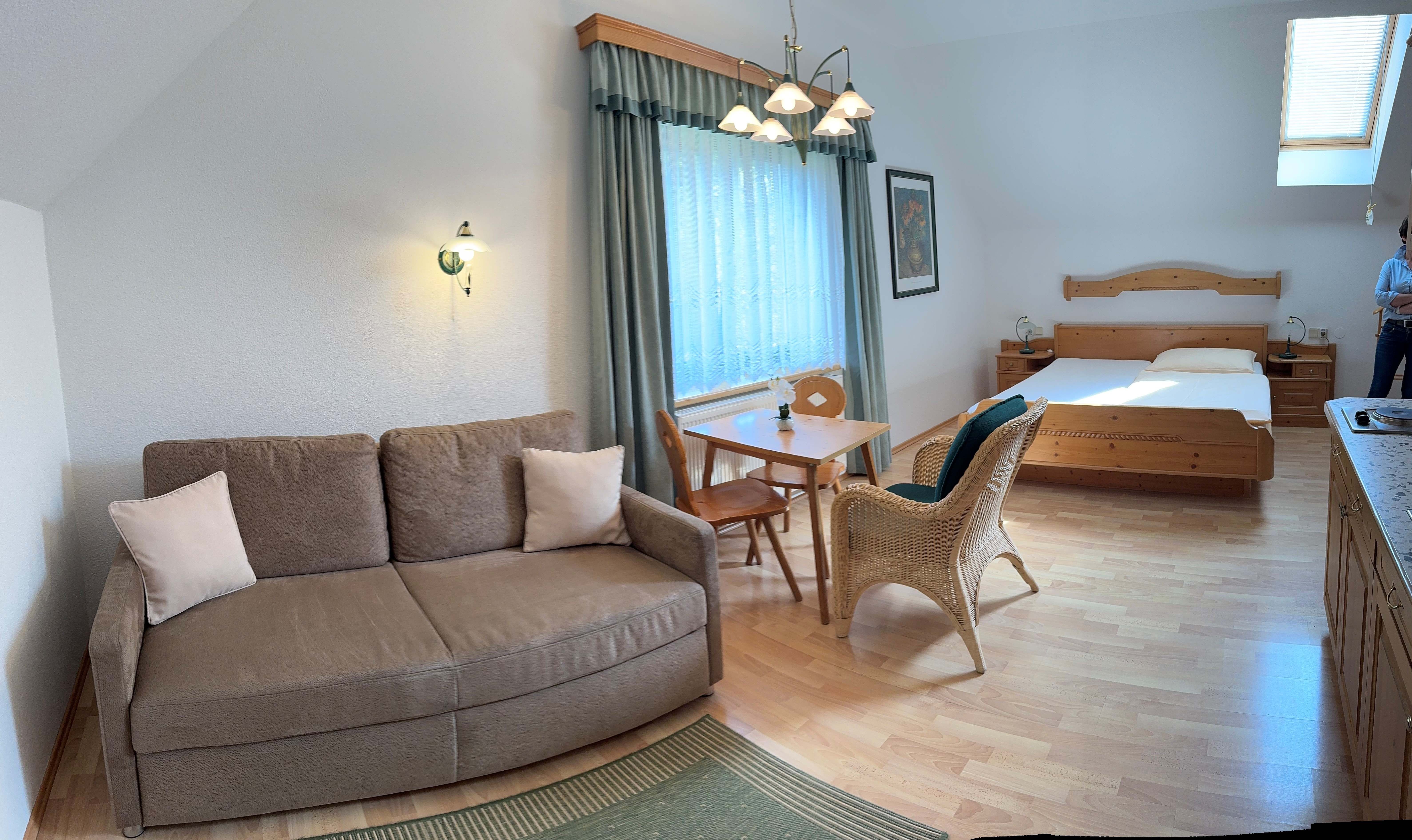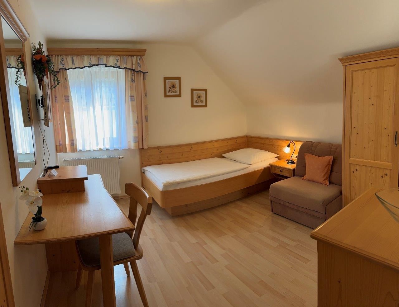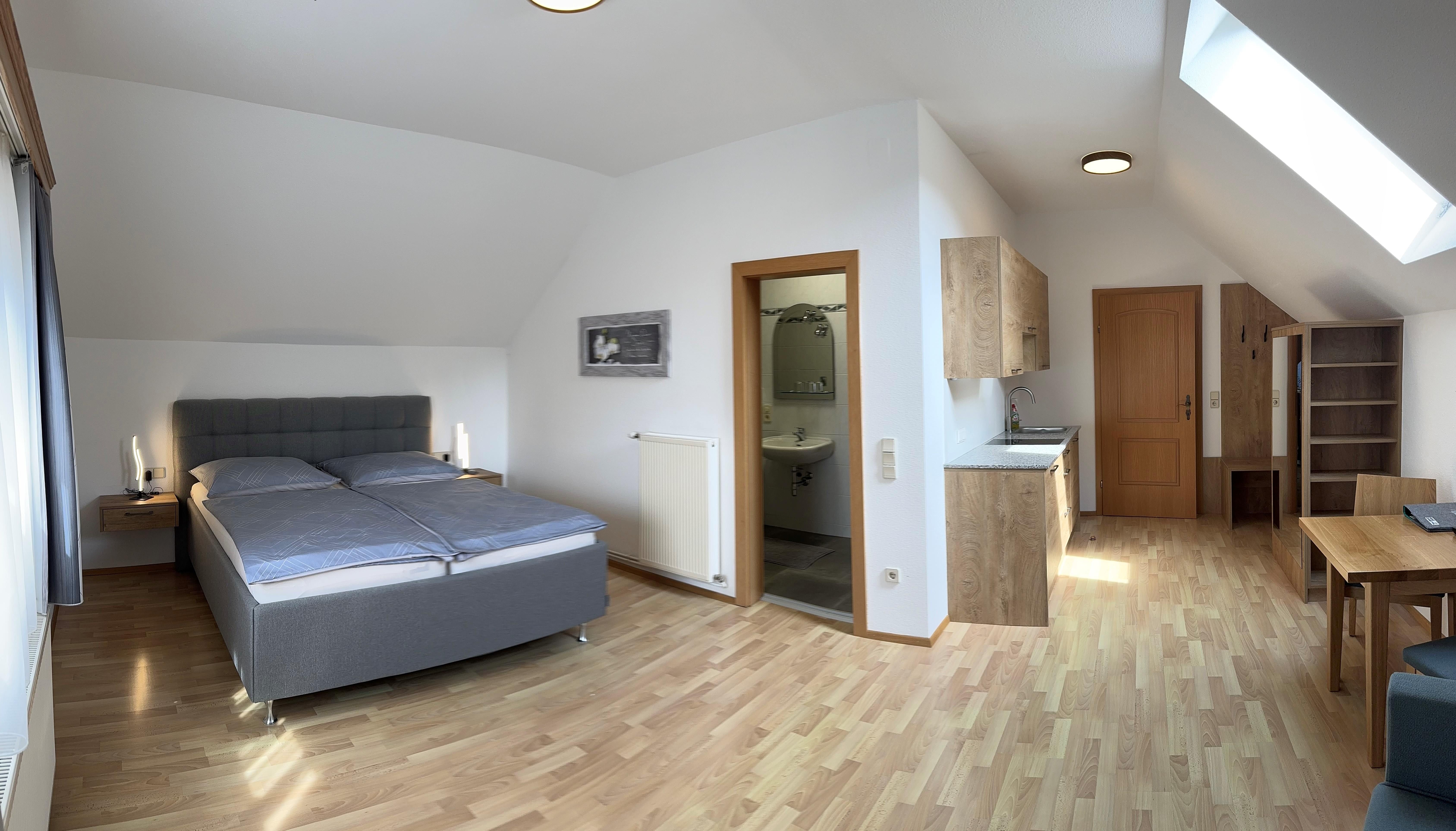 Die Zimmer des Via Sacra-Gastgebers sind alle neu ausgestattet und angenehm groß. Zum Teil verfügen sie über eine Kochgelegenheit. Rund um die Pension können Sie die Voralpen erwandern, auf 25 km Waldpromenaden spazieren und neue Energien auf einer "Gesundheitsrunde" auf dem Kneippweg sammeln.