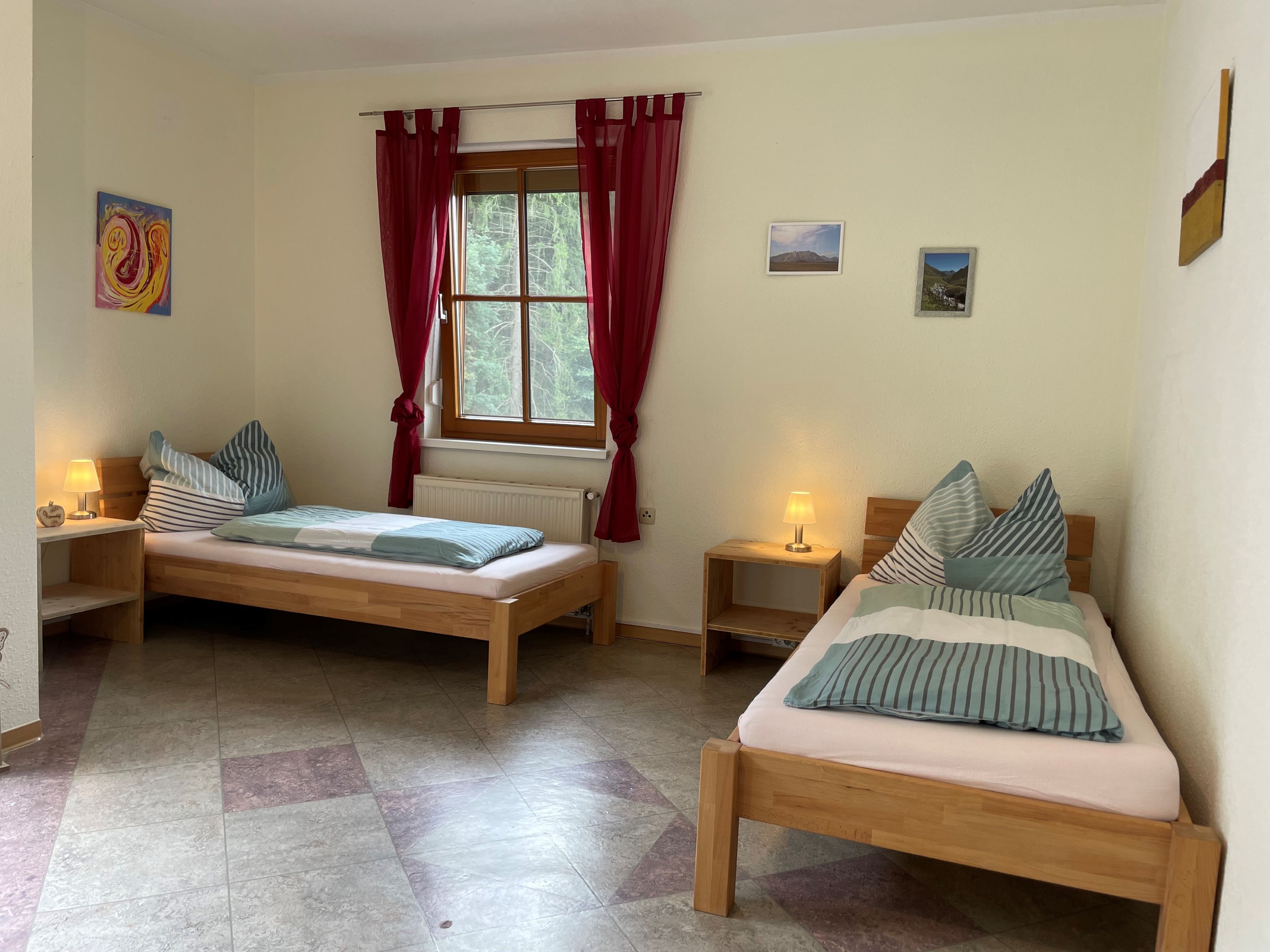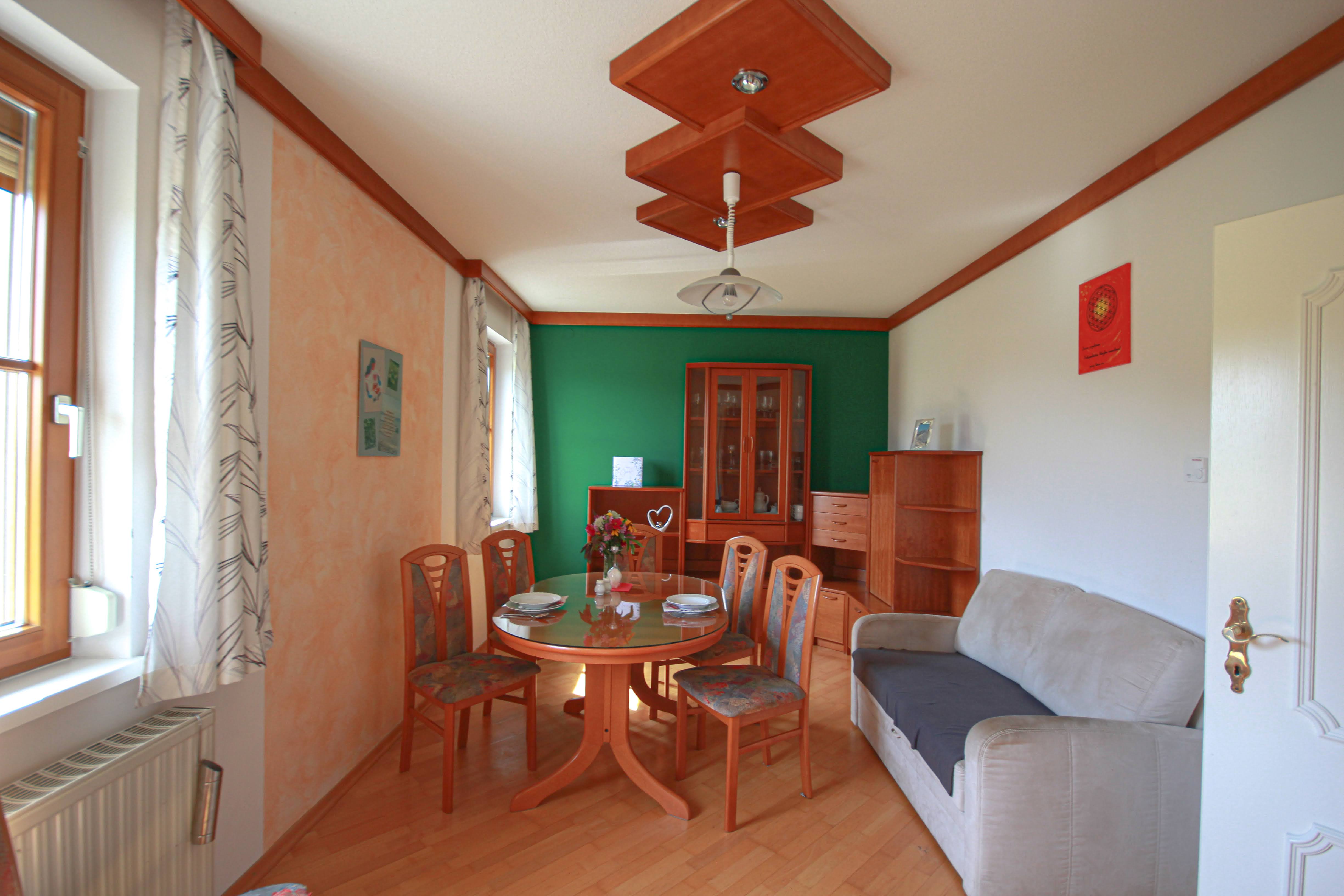 Unsere geräumige Ferienwohnung befindet sich im 1. Stock und ist über eine außen liegende Stiege zu erreichen und verfügt neben Eingangsbereich, Gang, Badezimmer, WC, Küche und Esszimmer über 2 Schlafzimmer und einen Balkon. Im großen Schlafzimmer sind 4 Einzelbetten. Von diesem Zimmer aus erreichst du den Balkon. Das kleine Schlafzimmer hat Platz für 2 Personen.
