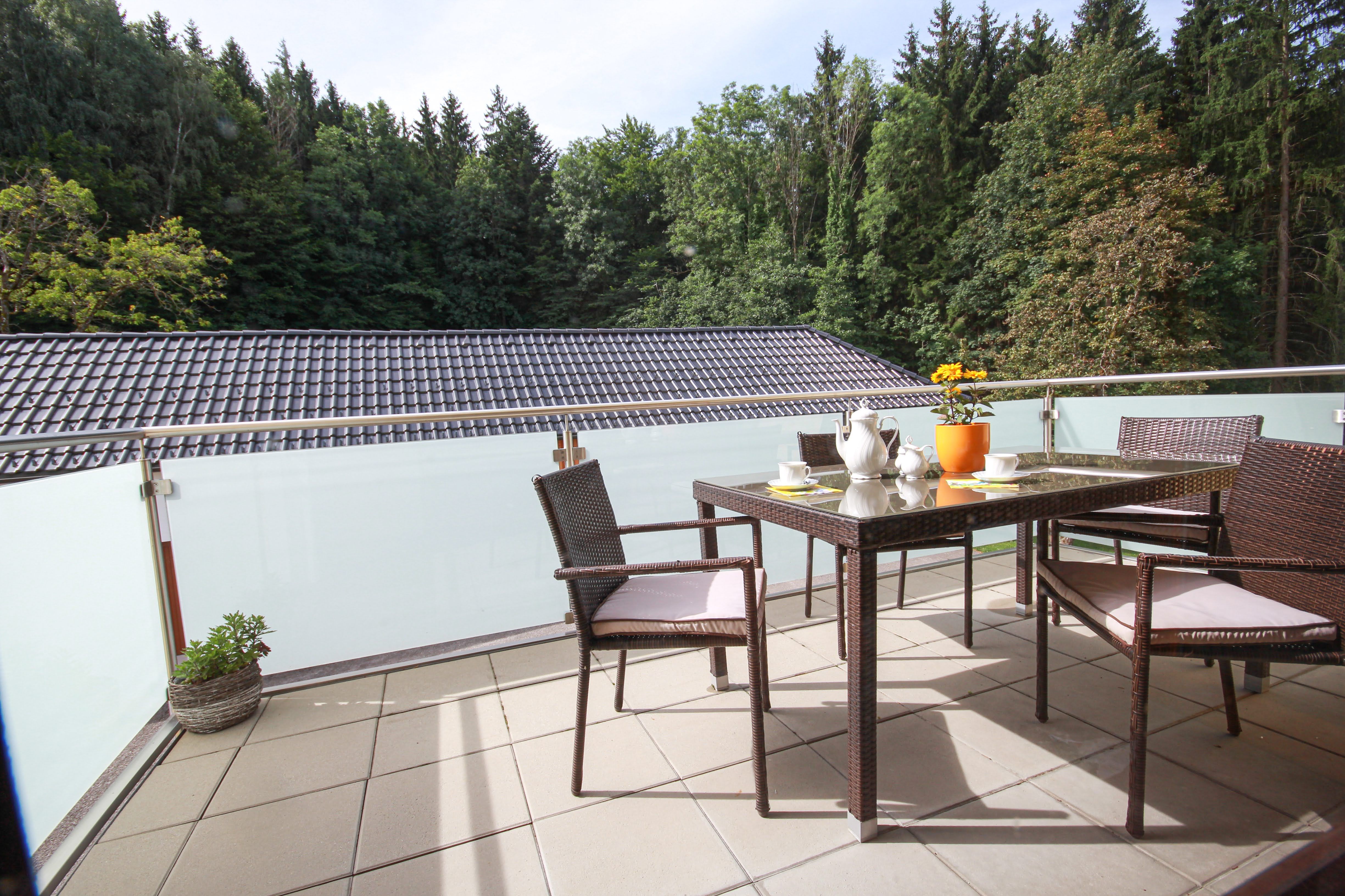 Direkt bei der Außenstiege ist ein eigener Gartenbereich mit Holzmöbeln, Liege, Feuerkorb und Grill.