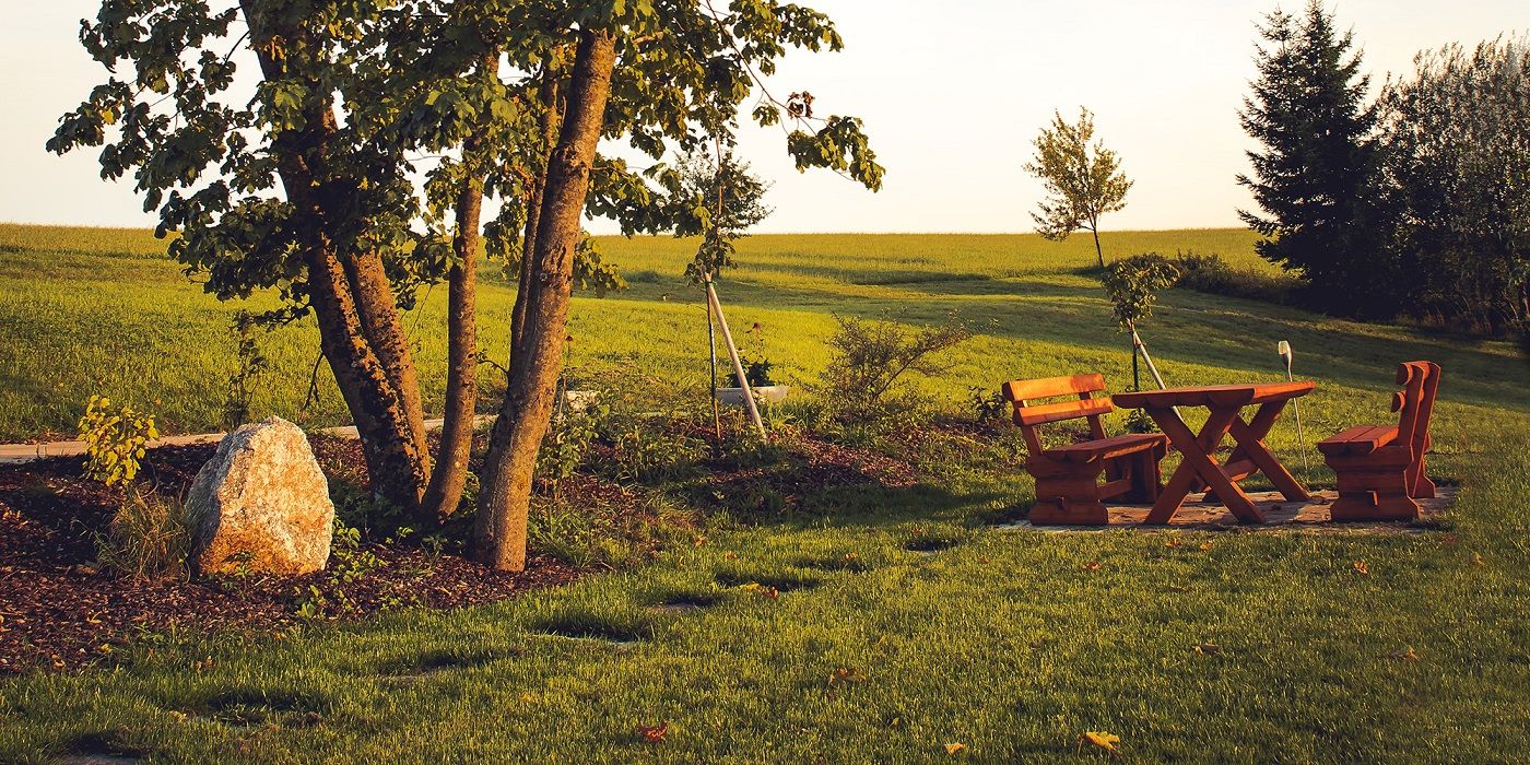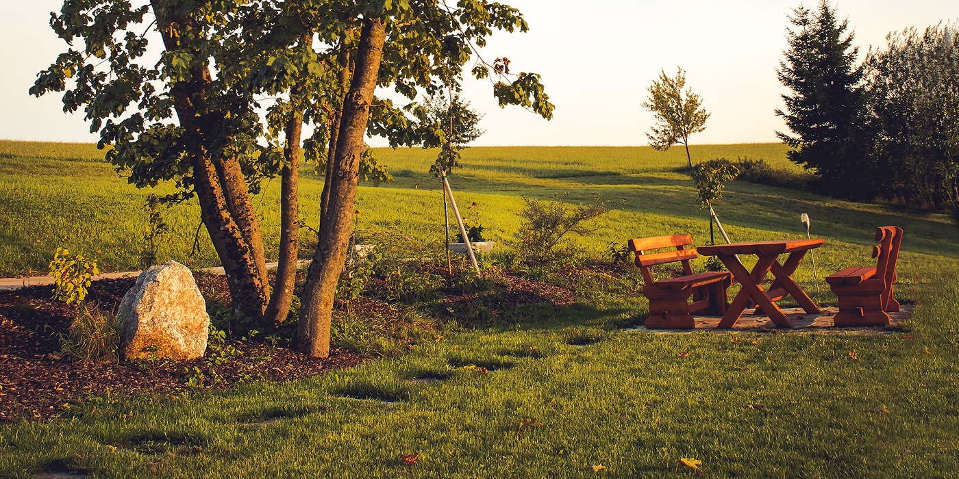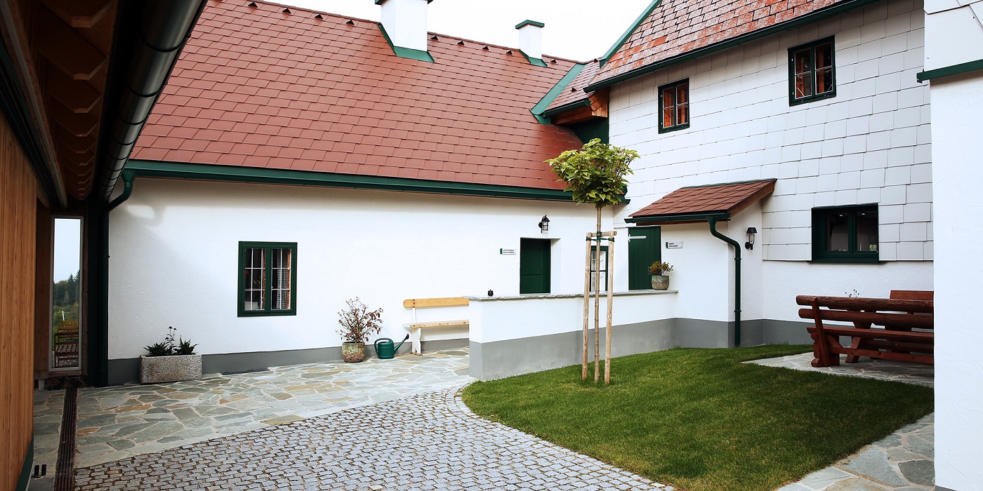 Im großzügigen Außenbereich befinden sich zahlreiche Sitzgelegenheiten (Sonnenterassen, überdachter Aussichtsplatz mit Panoramafenster, Brunnenplatzerl, Feuerstelle) zur Erholung und Entspannung.