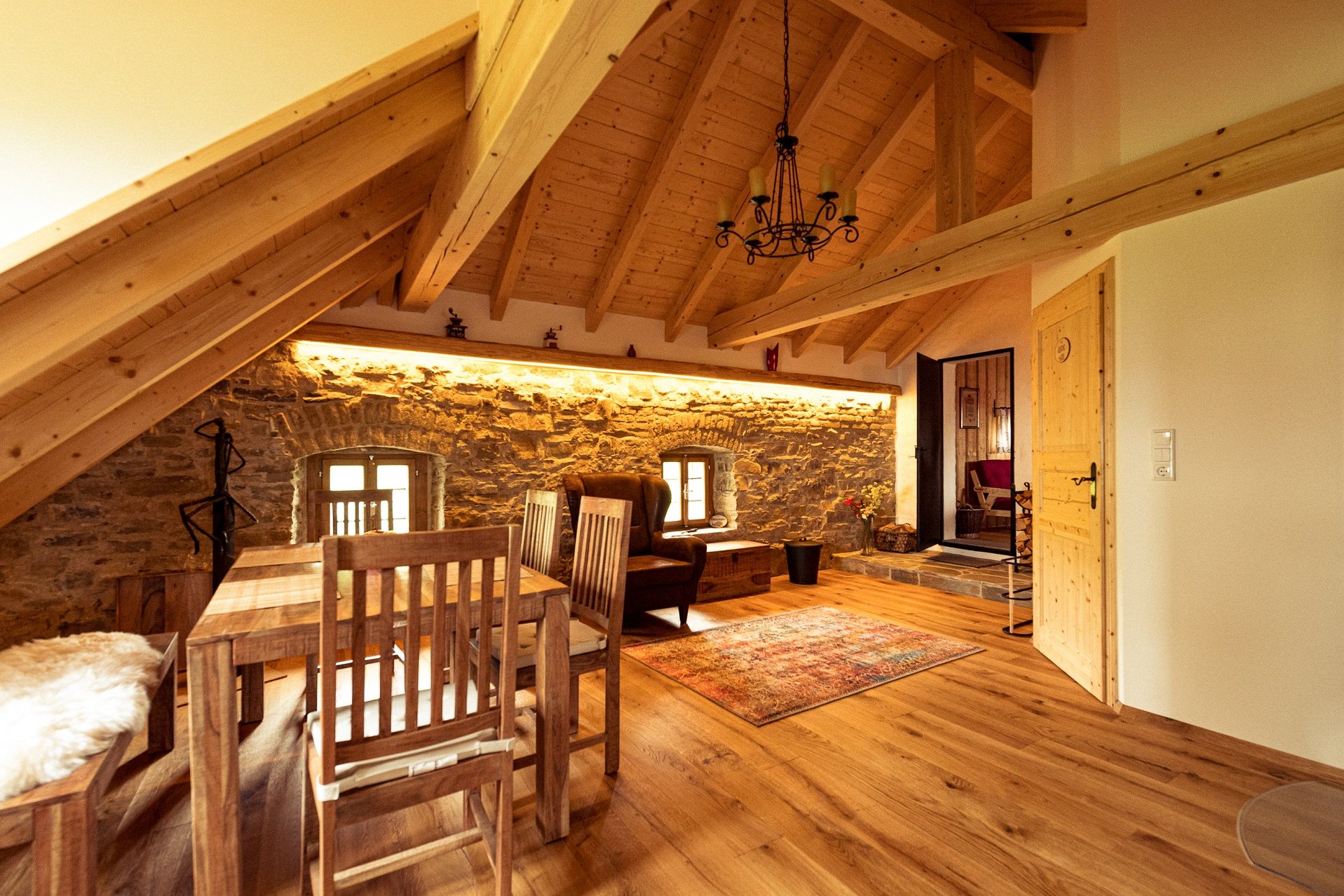 Im Ferienhaus befinden sich zwei separate, voll ausgestattete Ferienwohnungen. Die Ferienwohnung Panoramablick mit offenem Wohnbereich und Sichtdachstuhl ist ideal für zwei Personen. Eine Ausziehcouch bietet bei Bedarf zwei zusätzliche Schlafplätze. Die Ferienwohnung Mostviertelblick bietet ausreichend Platz für drei Personen und ist im gemütlichen ländlichen Stil eingerichtet. Durch die alten Steinmauern ist es auch an heißen Tagen angenehm kühl im Haus.