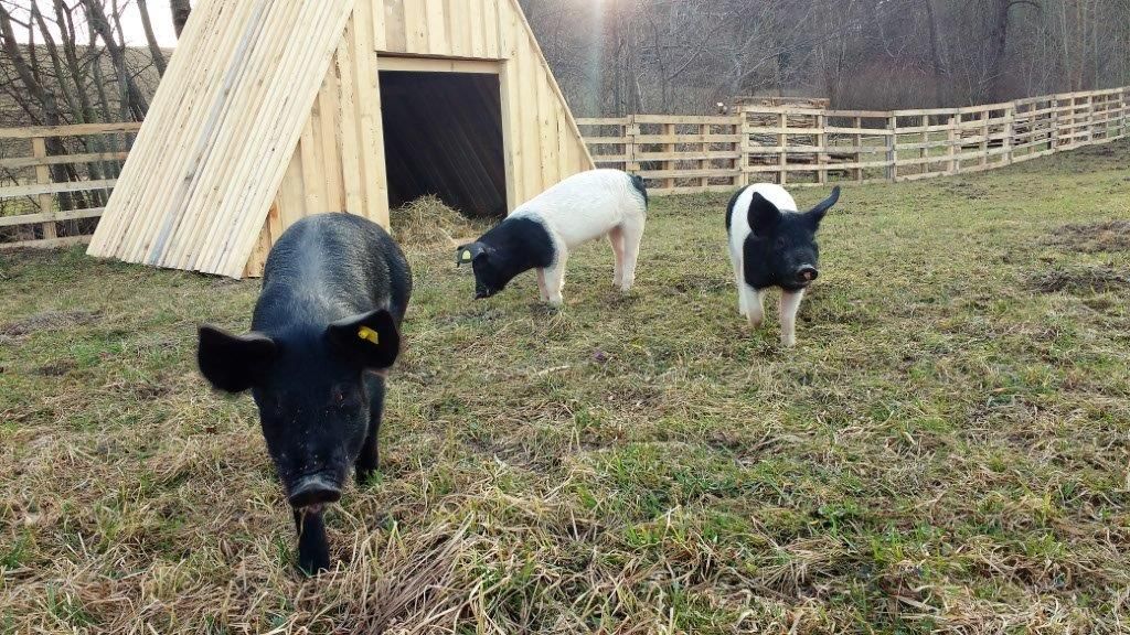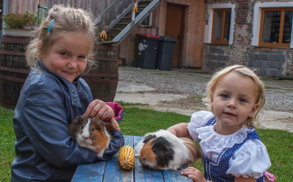 Wir haben viele Streicheltiere: Katzen, Kaninchen, Meerschweinchen, Zwergziegen, Hühner, Enten, Gänse, Freilandschweine und nicht zu vergessen Ponys