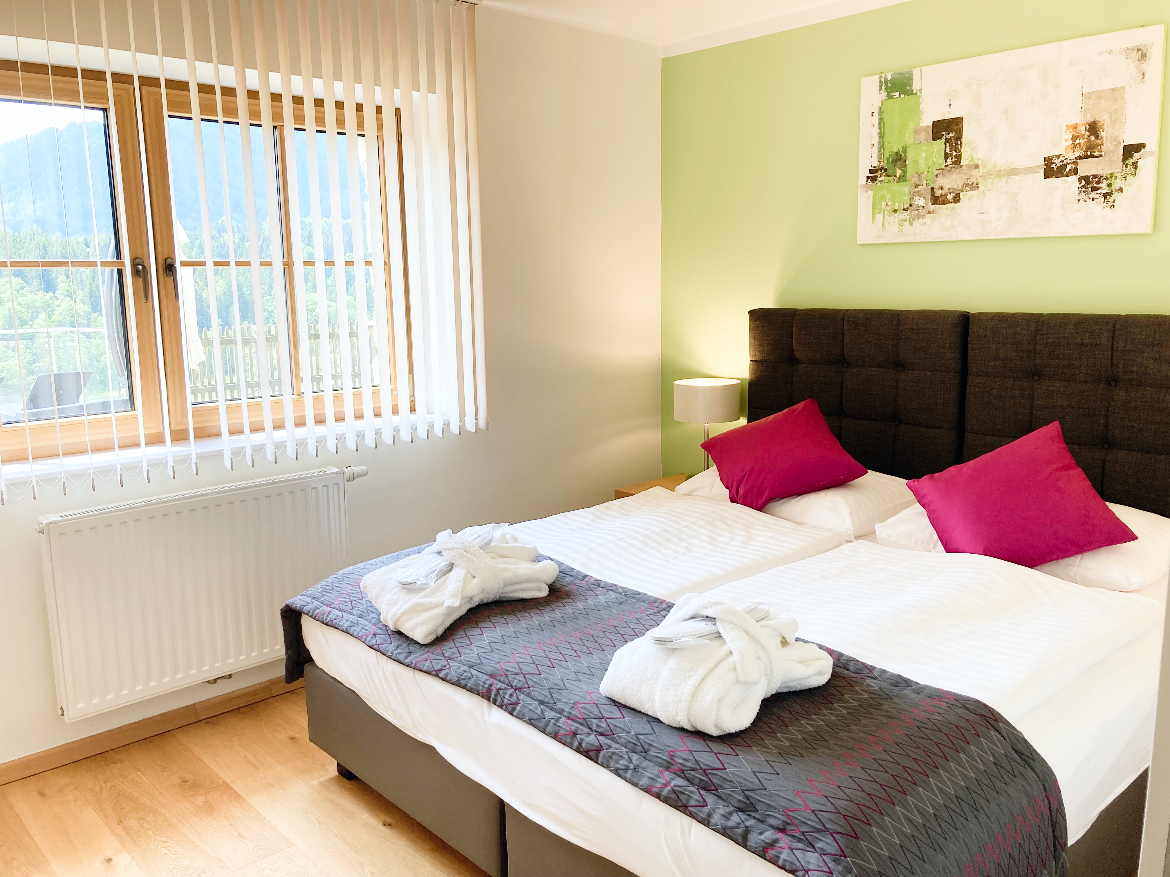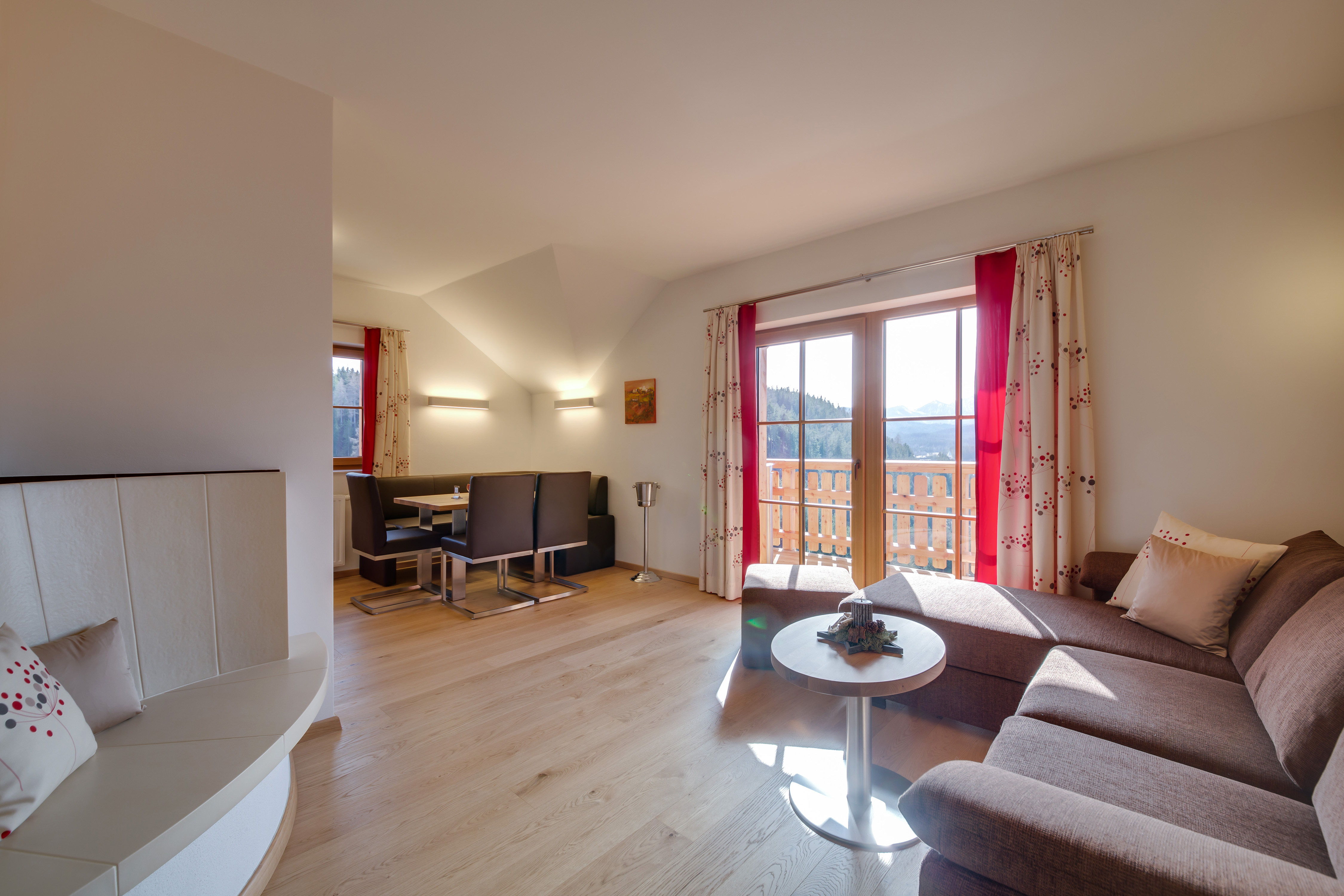 Es stehen Ihnen vier komfortabel eingerichtete Apartments zur Verfügung. Die drei großen Apartments für 1 - 5 Personen sind 100m2 groß. Jedes Luxus-Apartment verfügt über 2 Schlafzimmer mit jeweils eigenem Badezimmer, Dusche, WC, Wohn-Schlafzimmer mit Wärmebank, voll ausgestattete Küche mit Kaffeevollautomat, Schreibtisch, Telefon, WLAN, Weinkeller mit Minibar, Safe, Smart-TV und Balkon mit Blick auf die Bergwelt Mitterbachs. Jedem der großen Luxus-Apartments ist ein privater Spa Bereich mit herrlichem Bergpanorama angeschlossen. Der Wellnessbereich beinhaltet eine finnische Sauna inkl. Infrarotlicht und Lichtschiene, Badewanne sowie Ruhebereich und eigener Terrasse. Zudem befindet sich im Aparthotel ein eigener Weinkeller, in welchem für jedes der großen Apartments ein eigener Weinkühlschrank zur Verfügung steht.