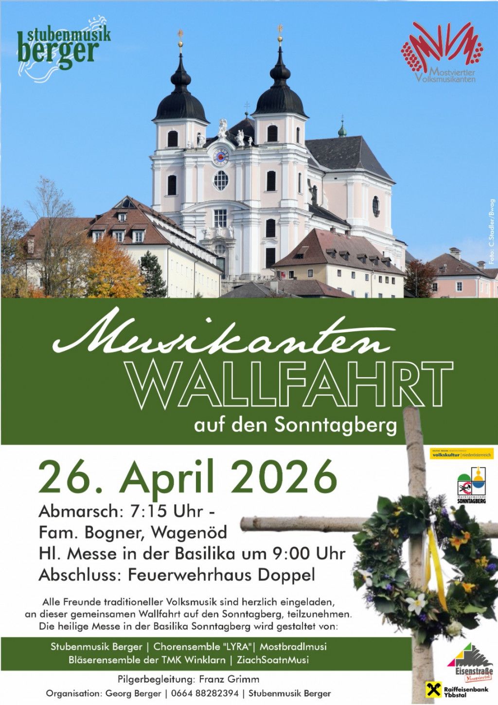 In der Blütezeit des Mostviertels laden die Mostviertler Volksmusikanten zur vierzehnten Volksmusikantenwallfahrt auf den Sonntagberg. Zur Danksagung für viele Stunden gemeinsamen Singens und Musizierens wollen sie nach einer kurzen Fußwallfahrt in der Basilika Sonntagberg innehalten und gemeinsam die heilige Messe musikalisch umrahmen.