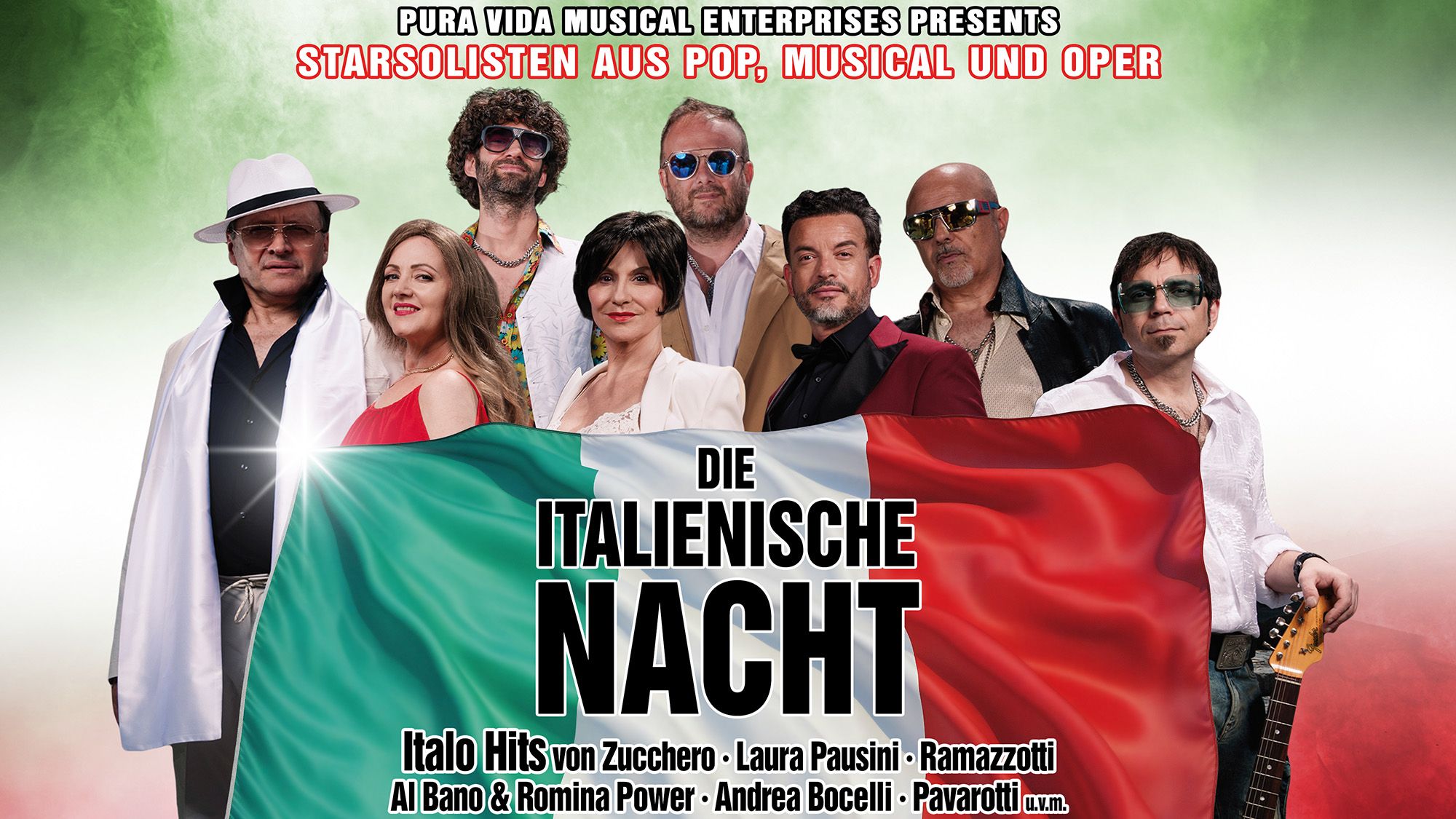 Ein großartiger Abend voller Italo-Hits und guter Laune erwartet das Publikum. La Banda Italiana, italienische Profimusiker und Stars der Pop- Musical- und Opernwelt präsentieren ein musikalisches Feuerwerk der Superlative. Hits von Zucchero – Laura Pausini – Al Bano & Romina Power – Andrea Bocelli – Eros Ramazzotti u. v. m. versetzen die Zuschauer in Urlaubsstimmung. Sommer, Sonne und Meer sind zum Greifen nah, Erinnerungen an den letzten und Vorfreude auf den kommenden Urlaub werden geweckt. Einzigartige Stimmen und eine umwerfende Band werden Sie mit ausgewählten Solo- Duett- und Ensemblenummern ins Italienfieber singen. Bekannte Songs wie Gente Di Mare, Sempre Sempre, Felicità oder Buona Domenica animieren zum Mitsingen und Mittanzen und das Ensemble verwandelt jeden Abend in eine Welt von Sonne, Sand und „dolce far niente“. Lassen Sie sich von diesem Bühnenfeuerwerk aus weltbekannten Italo Hits aus Schlager, Pop, Swing und Klassik mitreißen und seien Sie dabei, wenn Starsolisten die schönsten Melodien in einzigartiger Qualität anstimmen. Ein ausgefeiltes Licht- und Soundkonzept ist Teil der zweistündigen Show. Feiern sie mit uns einen Abend voll guter Laune und italienischem Lebensgefühl – La vita e bella!