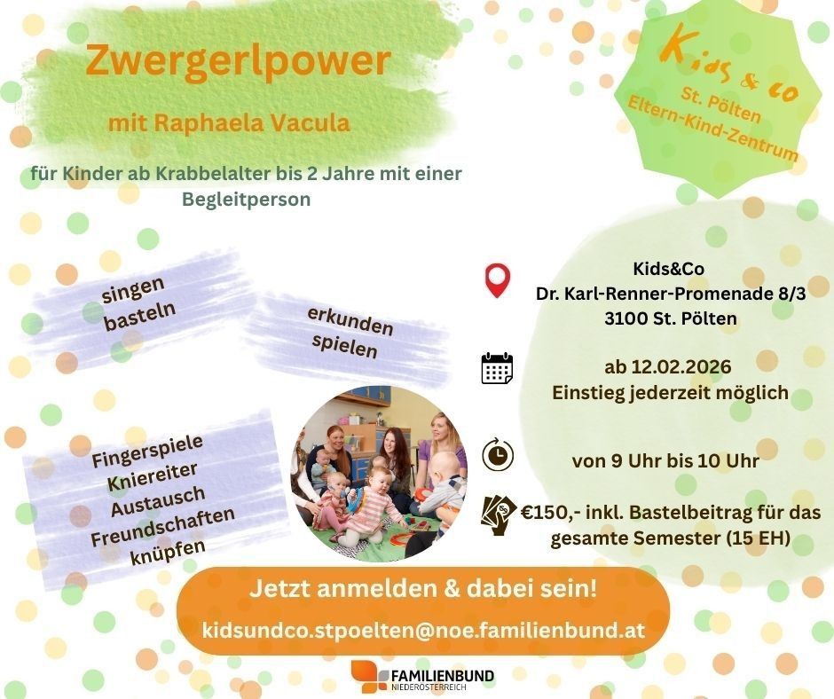 Zwergerlpower In unserer Eltern-Kind-Gruppe wird gesungen, gebastelt und geturnt. Weiters steht der Austausch und das Knüpfen von ersten Freundschaften bei uns an vorderster Stelle.